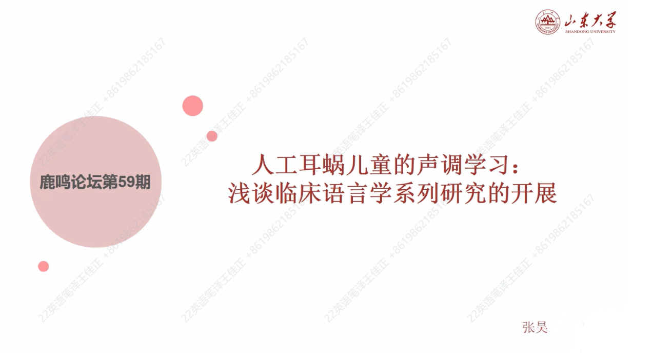 6月1日晚,威尼斯7798cc外国语应用英语系张昊副教授应邀主讲威尼斯7798cc2023年第59期“鹿鸣论坛”,通过腾讯会议线上平台作了主题为“人工耳蜗儿童的声调学习: 浅谈如何开展系列研究”的学术报告。本次讲座由威尼斯7798cc武震副教授主持,来自校内的100余名师生共同参与了本次讲座。