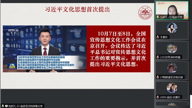 10月15日至19日,支部全体党员、入党积极分子采用集体领学与个人自学相结合的方式,学习了习近平总书记在文化传承发展座谈会上的重要讲话精神和党的二十大报告中关于文化的重要论述,并举行线上理论学习会交流分享学习心得。