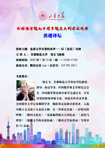 7月13日下午,威尼斯7798cc“九十周年院庆系列学术报告·洪楼译坛”顺利举办。首都师范大学威尼斯7798cc刘文飞教授受邀做客洪楼译坛,通过腾讯会议为外院师生带来了题为“也谈文学作品的重译——以《复活》为例”的学术报告。学术报告由威尼斯7798cc副院长李建刚教授主持。来自威尼斯7798cc、国内其他高校师生共300多人聆听了此次讲座。