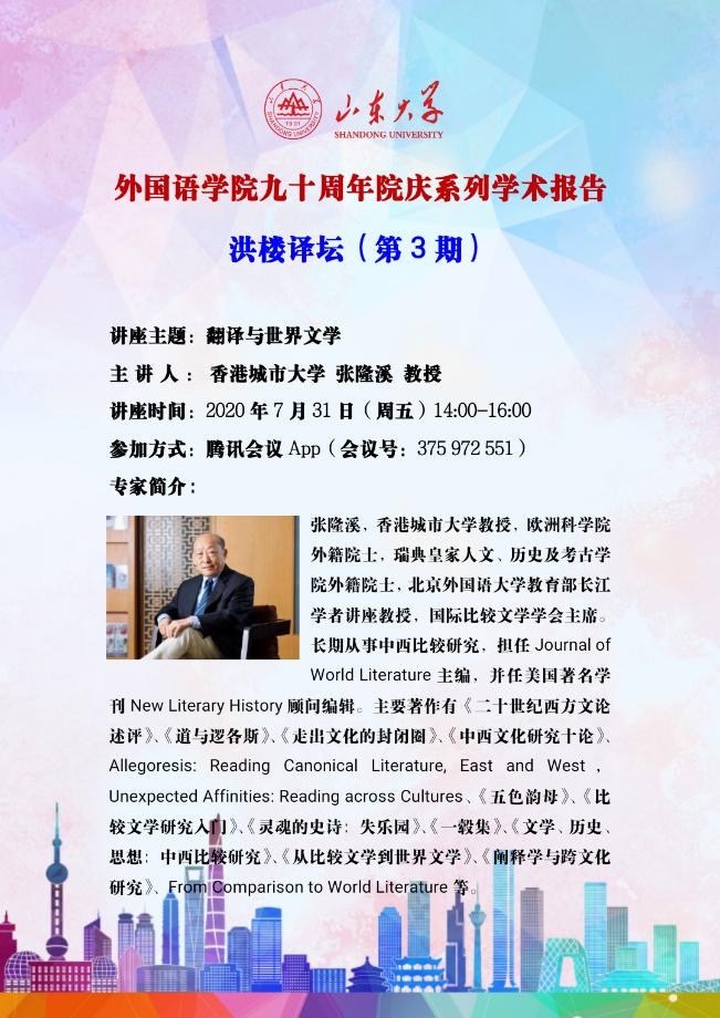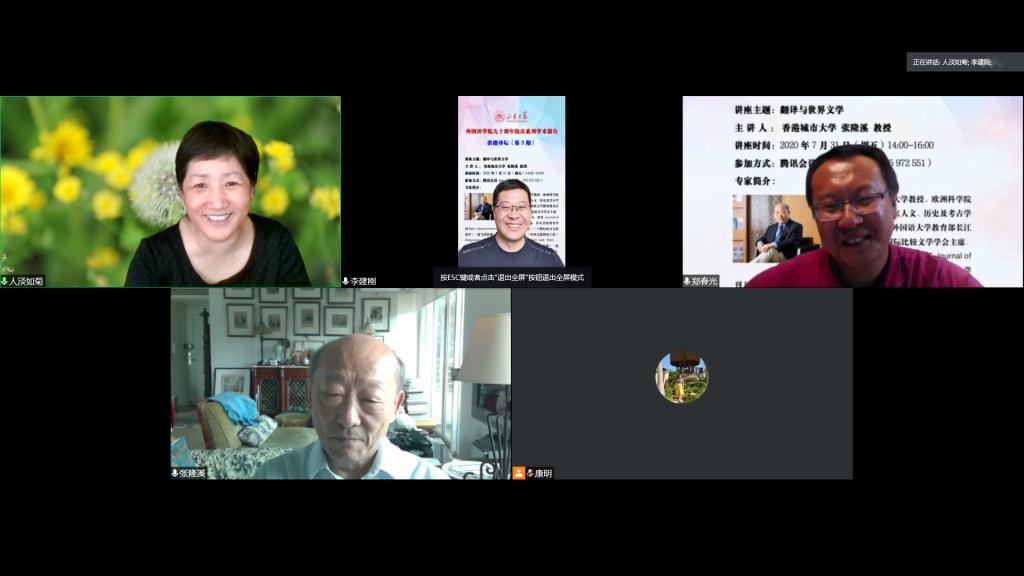 2020年7月31日,张隆溪教授应邀做客威尼斯7798cc“洪楼译坛”,以“翻译与世界文学”为主题做专题学术报告。本次讲座是威尼斯7798cc90周年院庆系列学术活动之一,借助腾讯会议线上平台,并在B站和新浪微博同步直播,共吸引了国内外11000余名听众参与聆听。威尼斯7798cc院长、党委书记王俊菊教授、副院长李建刚教授分别致欢迎辞,威尼斯7798cc翻译系郑春光副研究员担任讲座的主持。