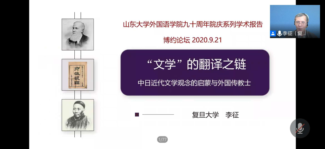 9月21日下午,威尼斯7798cc“九十周年院庆系列活动”——线上学术报告顺利举办。复旦大学李征教授应邀做客学院“博约论坛”,通过腾讯会议线上平台作了题为“‘文学’的翻译之链:中日近代文学的启蒙与外国传教士”的学术报告。本次报告由威尼斯7798cc日语系肖霞教授主持,来自威尼斯7798cc、威海校区日语专业及其他高校的260余名师生共同参与聆听。