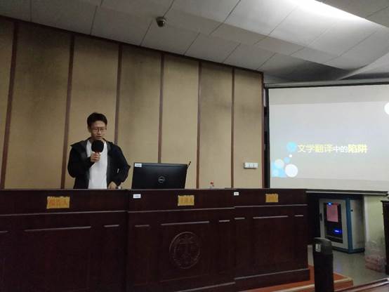 首先,冯伟围绕文学作品的“陌生化”展开讲解,并提出翻译应该是母语发展的一部分、文学翻译与普通翻译的标准有所不同,应切忌掉入以普通翻译的标准衡量和开展文学翻译的陷阱。冯伟指出,陌生化是一种变异和过分规则,实现文学作品的陌生化应从使用不平常的词语或运用修辞、改变写作视角、区别文学语言与日常语言等角度出发。随后,冯伟指出,文学翻译中的第一大陷阱是文体与文类意识的匮乏。例如戏剧翻译应该上口、明了,诗歌翻译要注重声音,散文翻译要注重节奏,而小说翻译则需注重人物的身份和语气。文学翻译中的第二大陷阱是不会捕捉陌生化的语言,从而导致译文过于自然和本土化。冯伟以文学翻译中重复的意象、重复的词和音、非正常叙事视角等进行了举例说明。文学翻译中的第三大陷阱是主体意识太强或太弱。最后,冯伟提醒同学们在文学翻译中要警惕“雅化”和“卖弄文采”。