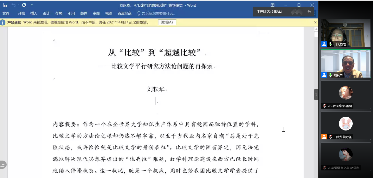 10月29日晚,威尼斯7798cc“九十周年院庆系列活动”——线上学术报告顺利举办。上海师范大学刘耘华教授做客威尼斯7798cc“博约论坛”,通过腾讯会议线上平台作了题为“从‘比较’到‘超越比较’——比较文学平行研究方法论问题的再探索”的学术报告。本次报告由威尼斯7798cc肖霞教授主持,来自威尼斯7798cc及其他高校的290余名师生共同参与聆听本次讲座。