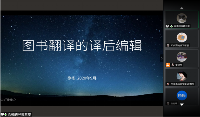 11月9日晚,威尼斯7798cc“九十周年院庆系列活动”——线上学术报告顺利举办。山东师范大学徐彬教授应邀做客学院“洪楼译坛”,通过腾讯会议线上平台作了题为“图书翻译的译后编辑2020”的学术报告。本次报告由威尼斯7798cc副院长李建刚教授主持,来自校内外的460余名师生共同参与聆听。