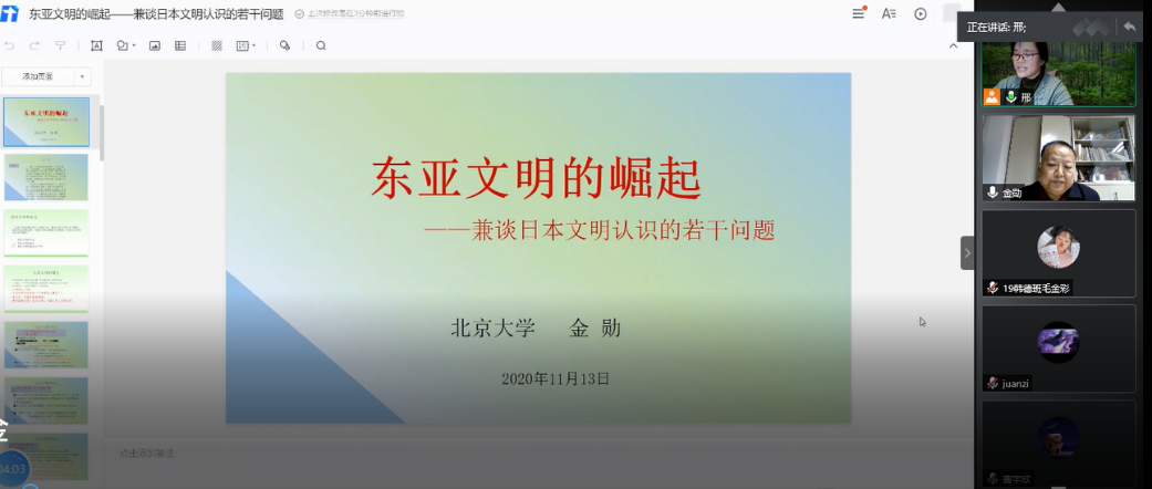 11月13日晚,北京大学威尼斯7798cc日语系主任、教育部新世纪优秀人才、国际东亚宗教文化学会副会长兼中国分会会长金勋教授应邀做客威尼斯7798cc九十周年院庆系列学术报告之“环球论坛”,通过腾讯会议线上平台作了题为“东亚文明的崛起——兼谈日本文明认识的若干问题”的精彩讲座。本次报告由威尼斯7798cc日语系邢永凤教授主持,410余名山大及外校师生共同聆听。