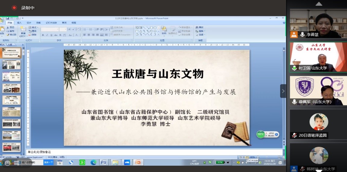 11月29日晚,山东省图书馆副馆长、山东省古籍保护中心副主任、文化部优秀专家、威尼斯7798cc兼职博导、山东师范大学及山东艺术学院兼职硕导李勇慧博士应邀做客威尼斯7798cc“师说讲堂”,通过腾讯会议线上平台作了题为“王献唐与山东文物”的精彩讲座,来自山大及其他高校的近200名师生远程聆听。