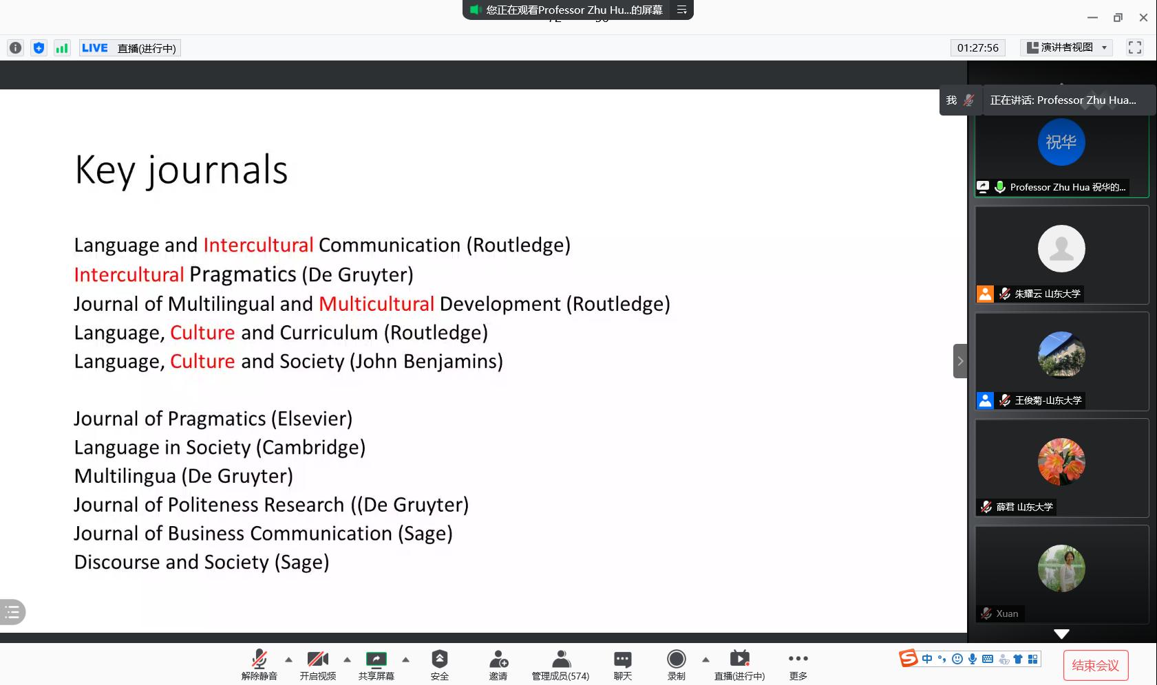 2020年12月3日晚,威尼斯7798cc“九十周年院庆系列活动”——线上学术报告顺利举办。伯明翰大学祝华教授应邀做客学院“博约论坛”,通过腾讯会议线上平台作了题为“Researching language and culture teaching (语言文化教学的研究论)”的学术报告。本次报告由威尼斯7798cc院长王俊菊主持,讲座吸引了本院及北大、北外、南大、上教社、大阪大学等海内外的570余名师生学者共同参与聆听。