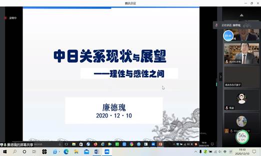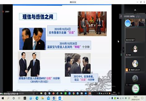 12月10日晚,上海外国语大学日本研究中心主任、中日韩合作研究中心执行主任廉德瑰教授应邀做客山大外院“师说讲堂”,通过腾讯会议线上平台做了题为“中日关系的现状与未来”的精彩讲座。来自山大及其他高校的300多名师生远程聆听。