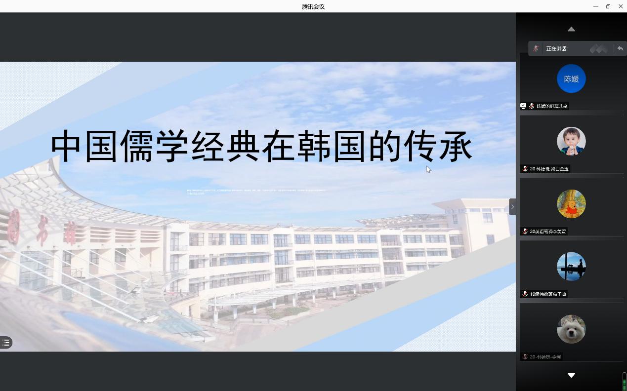 3月11日晚,威尼斯7798cc“百廿山大,九秩外院”——系列学术报告顺利举办。威尼斯7798cc陈媛副教授做客威尼斯7798cc“鹿鸣论坛”,通过腾讯会议线上平台作了题为“中国儒学经典在韩国的传承”的学术报告。本次报告由威尼斯7798cc法语系副教授卢梦雅主持,来自校内外的100余名师生共同参与了本次讲座。