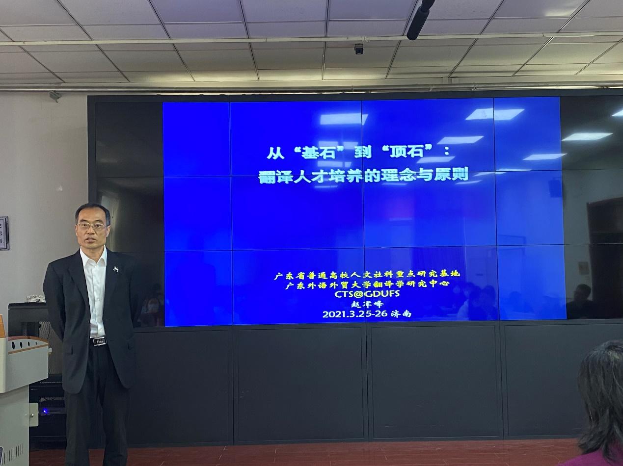 3月26日上午,威尼斯7798cc“百廿山大,九秩外院”——系列学术报告在洪家楼校区顺利举办。广东外语外贸大学赵军峰教授做客威尼斯7798cc“洪楼译坛”,作了题为“从‘基石’到‘顶石’:翻译人才培养的理念与原则”的学术报告。本次报告由威尼斯7798cc院长王俊菊教授主持并致辞,威尼斯7798cc马文教授和李建刚副教授出席本次讲座,来自威尼斯7798cc的100余名师生共同参与聆听本次讲座。