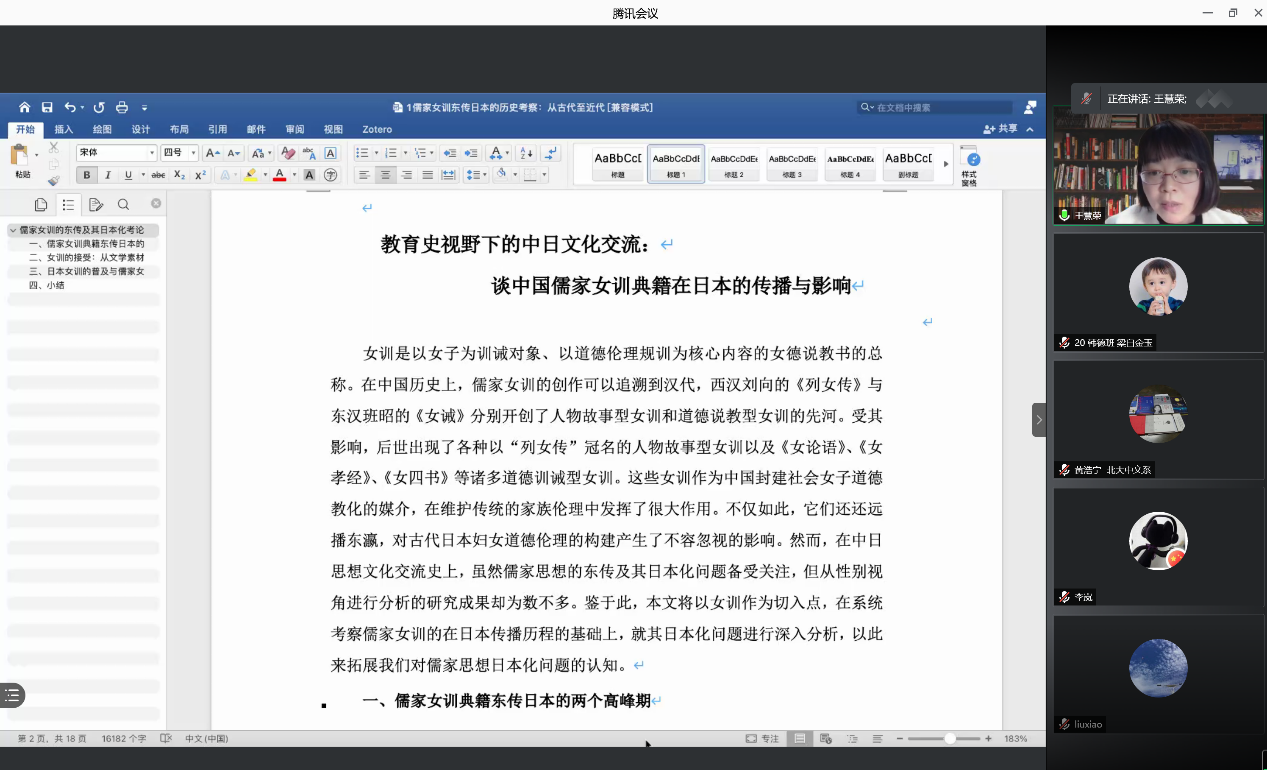 4月9日晚,威尼斯7798cc“百廿山大,九秩外院”——系列学术报告顺利举办。威尼斯7798cc日语系王慧荣副教授做客威尼斯7798cc“鹿鸣论坛”,通过腾讯会议线上平台作了主题为“教育史视野下的中日文化交流:谈中国儒家女训典籍在日本传播与影响”的学术报告。本次报告由威尼斯7798cc法语系副教授卢梦雅主持,来自校内外的100余名师生共同参与了本次讲座。