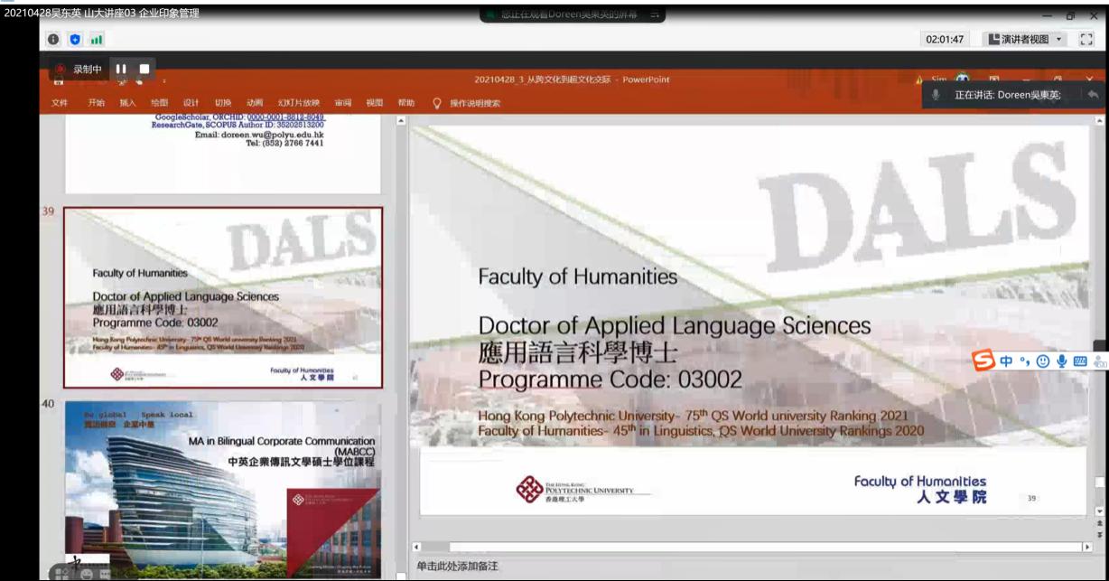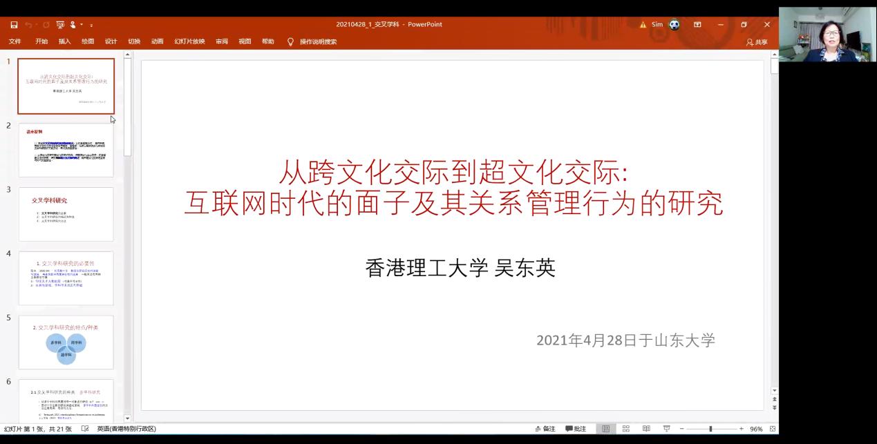 4月28日晚,威尼斯7798cc“百廿山大 九秩外院”系列学术报告顺利举办。香港理工大学吴东英副教授做客威尼斯7798cc“博约论坛”,通过腾讯会议线上平台作了主题为“从跨文化交际到超文化交际:互联网时代的面子及其关系管理行为的研究” 的学术报告。本次报告由威尼斯7798cc副院长马文教授主持,吸引了本校及来自港理大、北外、广外、中传等370余名师生共同参与聆听。