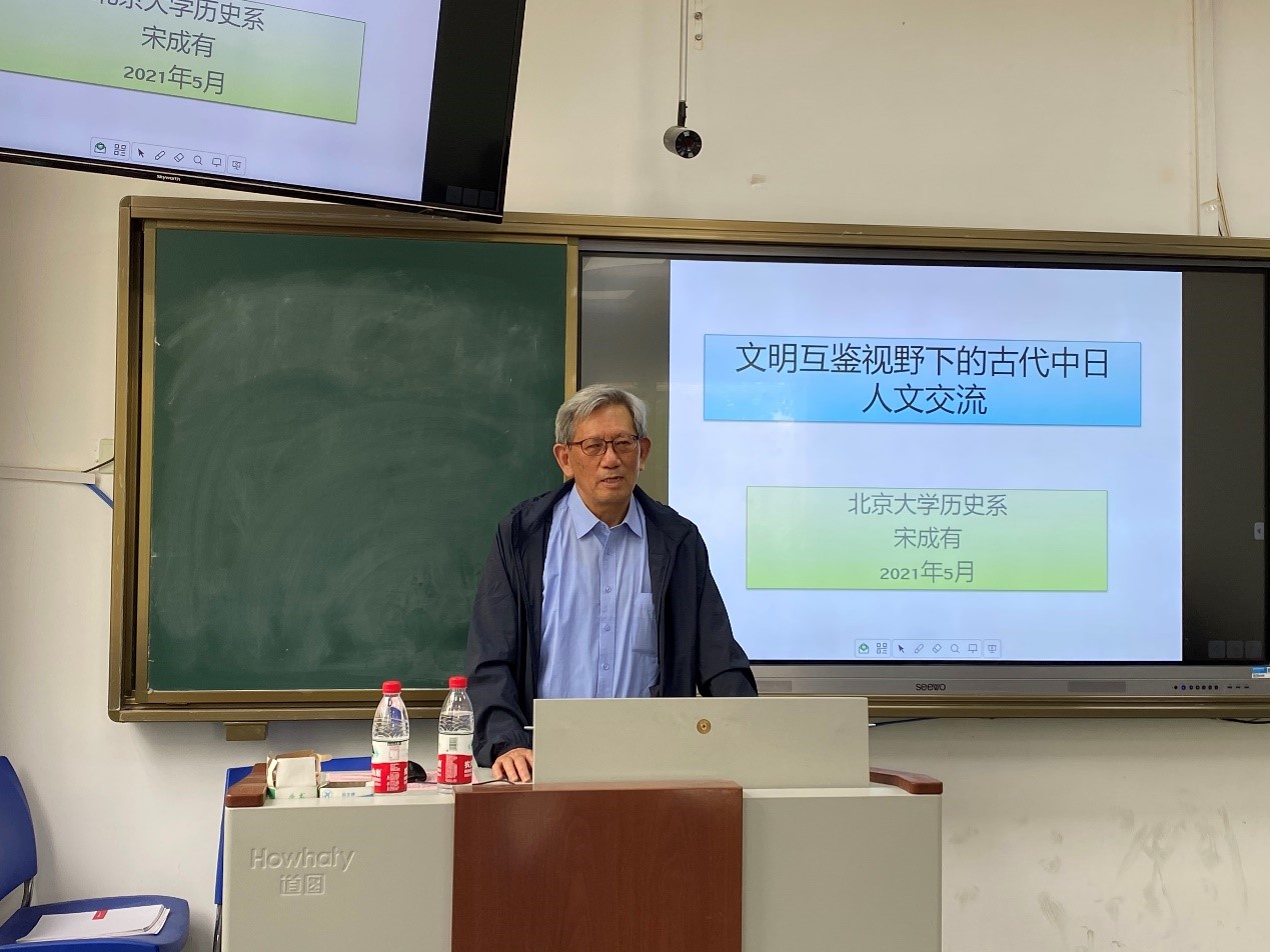 讲座开场,宋成有从渠道、内容、意义三方面讲解了中日人文交流的概况与中日文化交流的前提,其中重点介绍了中日人文交流的官方渠道和民间渠道。官方渠道可以见诸两国正史,虽时断时续但也有完整的记述,民间交流有多种多样的形式,意图修复两国关系,两千年间持续不断。接着宋成有讲到了人文交流的关键点,也就是异质文化引进后的变通,通过圣德太子改革、大化改新、《日本书纪》编纂三个例子重点阐述了古代日本如何变通引进的中国文化。最后宋成有介绍了日本文化的特点及其与中国文化的关系。讲座结束后,王慧荣进行了简单点评,在座师生踊跃提问,其中,对于“如何看待推古天皇向隋炀帝递交的国书中提到‘日出处天子致书日没处天子’的表述”一问,宋成有教授表示日本谋求政治上的平等,但在文化上积极向中国学习,对政治和文化的联系应当审慎分辨。
