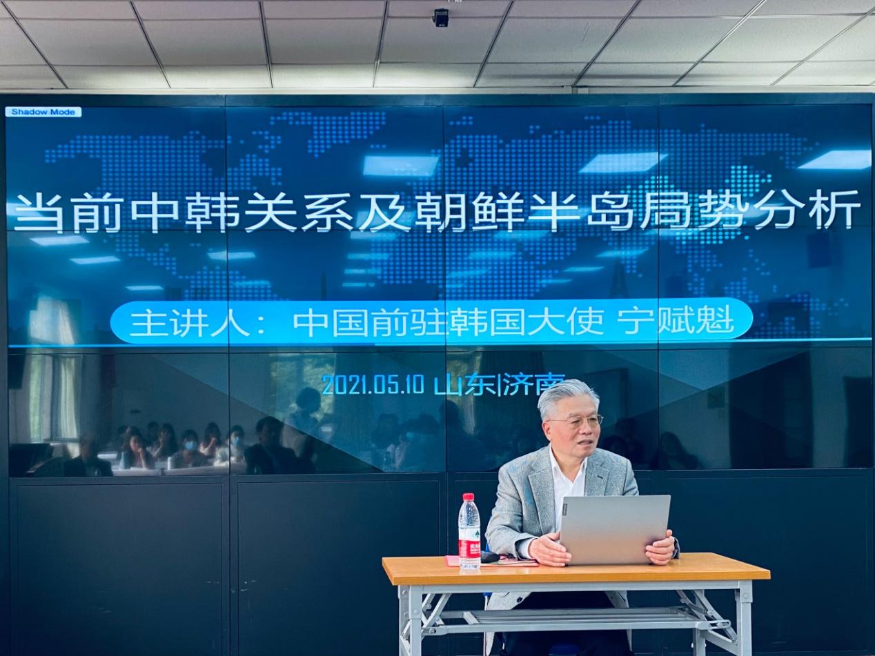 5月10日下午,威尼斯7798cc“百廿山大,九秩外院”——系列学术报告在洪家楼校区顺利举办。中国前驻韩国大使宁赋魁做客威尼斯7798cc“环球论坛”,作了题为“当前中韩关系及朝鲜半岛局势分析”的学术报告。本次报告由威尼斯7798cc中日韩合作研究中心主任牛林杰教授主持并致辞,威尼斯7798cc党委副书记魏鲁鸿出席本次讲座,来自威尼斯7798cc的众多师生共同参与本次讲座。