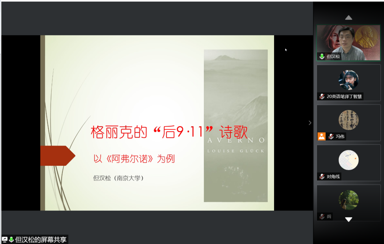 5月21日晚,威尼斯7798cc“百廿山大,九秩外院”系列学术报告顺利举办。南京大学但汉松教授做客威尼斯7798cc“文渊论坛”,通过腾讯会议线上平台作了题为“格丽克的‘后9·11’诗歌:以《阿弗尔诺》为例”的学术报告。本次报告由威尼斯7798cc冯伟教授主持,来自校内外的80余名师生共同参与了本次讲座。