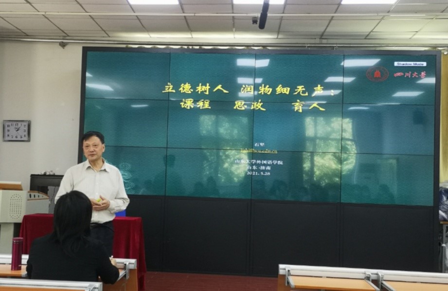 石坚教授的讲座主题为:“立德树人,润物细无声:课程 思政 育人”。石教授现身说法,报告内容既涵盖大局政策,又辅以感人实例,娓娓道来,让人热泪盈眶,感慨万千。石教授指出,在国际国内的新形势下,外语类教师要积极响应习近平总书记对于教育提出的“培根铸魂、启智润心”的要求,寓价值观引导于知识传授和能力培养之中,帮助学生塑造正确的世界观、人生观和价值观。他强调,“立德树人”是高校的根本任务,在课程设置上应注重“厚通识、宽视野、多交叉”。他以四川大学外国语言文学学科的公共平台课为例,介绍了如何提炼学科、专业、课程的元素,如何从“三个度”展开课程思政,如何开出“博雅、人文、面向未来”的课程。同时,他通过讲述令学生终身受益的几位老师的故事,生动阐释了“育人出自细节中”、“润物细无声”的深刻内涵。石教授特别指出大学外语教育,对于坚定文化自信,讲好中国故事,构建人类命运共同体,具有至关重要的作用。