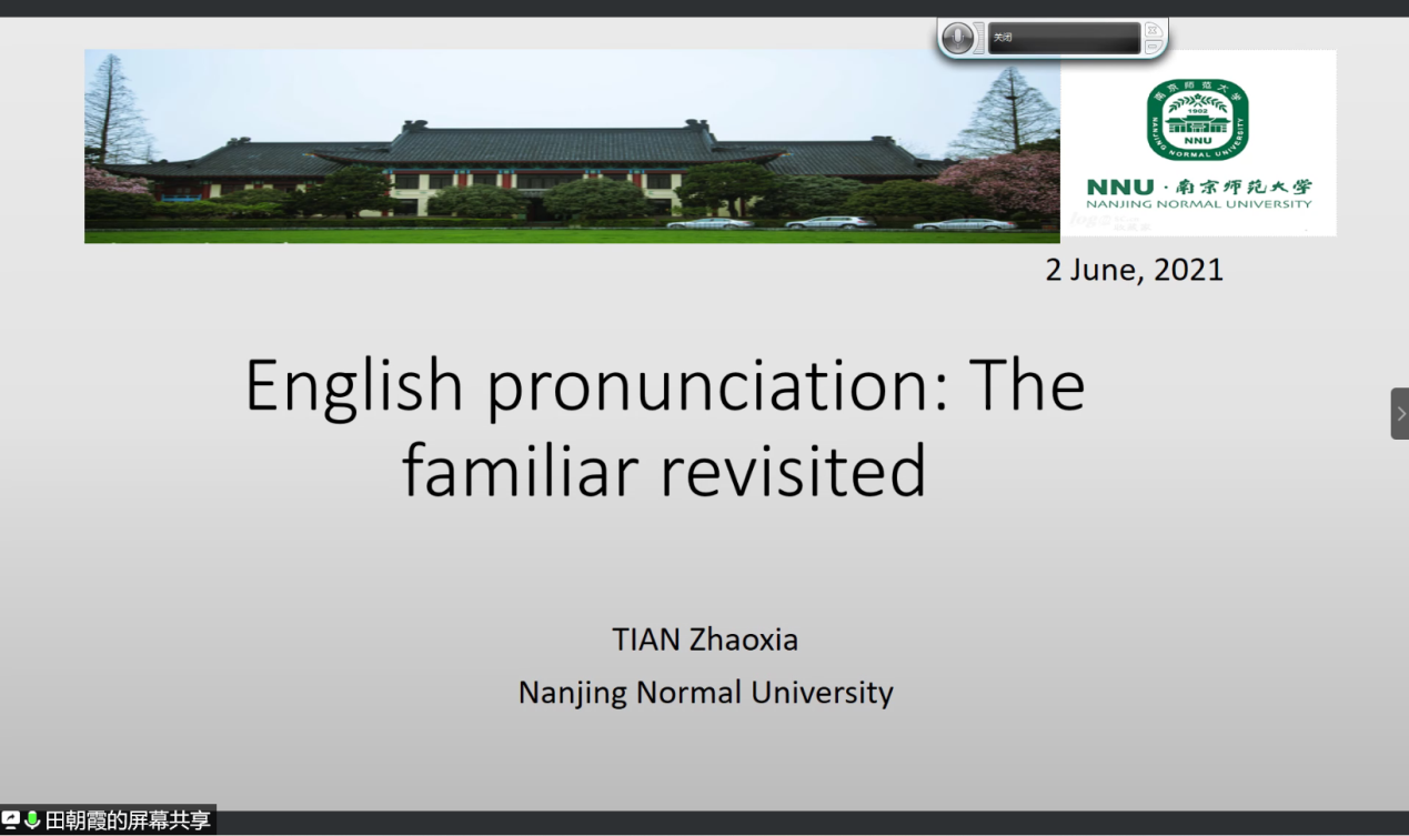 6月2日晚,威尼斯7798cc“百廿山大,九秩外院”系列学术报告顺利举办。南京师范大学威尼斯7798cc副院长田朝霞教授做客威尼斯7798cc“知新沙龙”,通过腾讯会议线上平台进行了主题为“走出语音学习的误区”的学术报告。本次讲座由威尼斯7798cc英语系副教授张溪主持,来自校内外的50余名师生共同参与本次讲座。