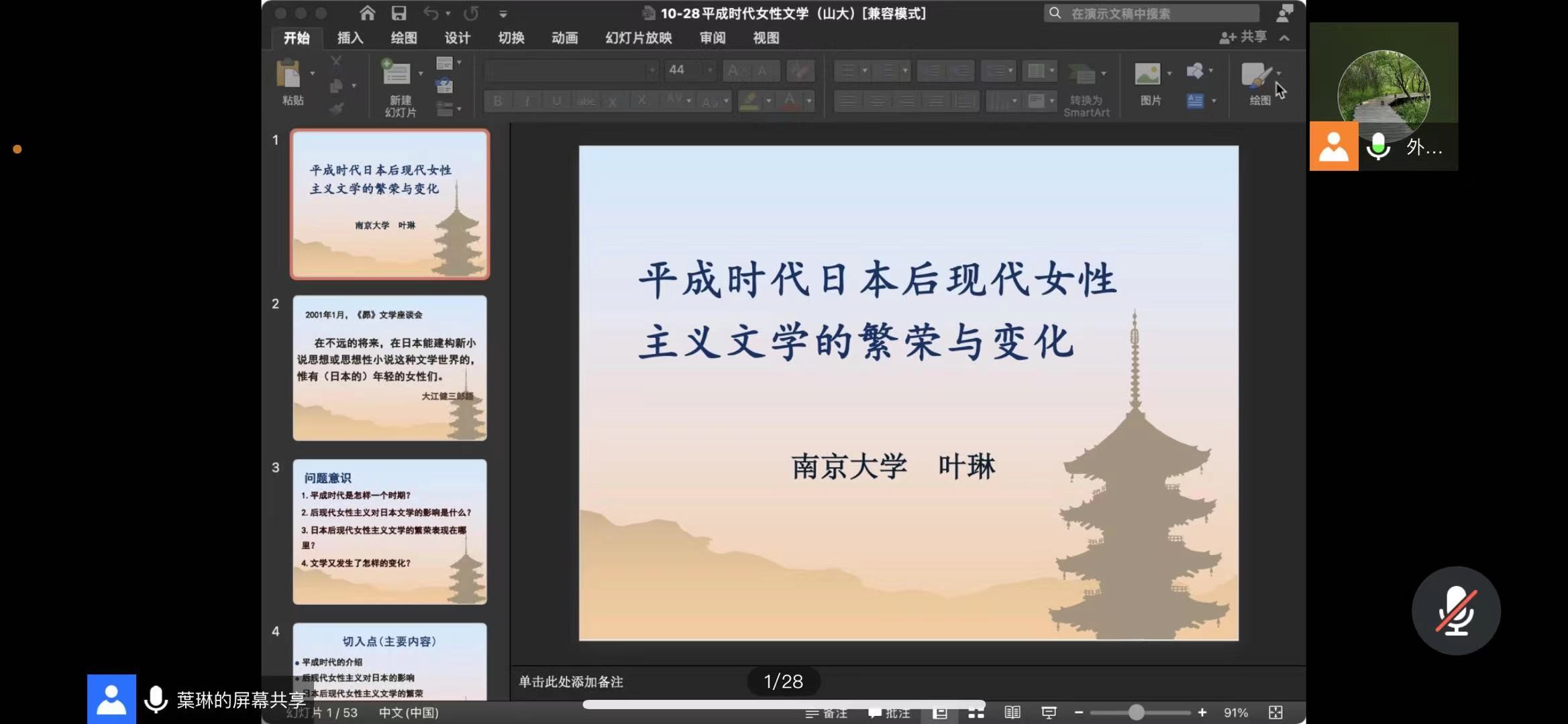 10月28日晚,威尼斯7798cc“百廿山大,九秩外院”系列学术报告顺利举办。南京大学威尼斯7798cc叶琳教授做客威尼斯7798cc“博约论坛”,通过腾讯会议线上平台作了主题为“平成时代日本后现代女性主义文学的繁荣与变化”的学术报告。本次讲座由威尼斯7798cc日语系肖霞教授主持,来自校内外的200余名师生共同参与本次讲座。