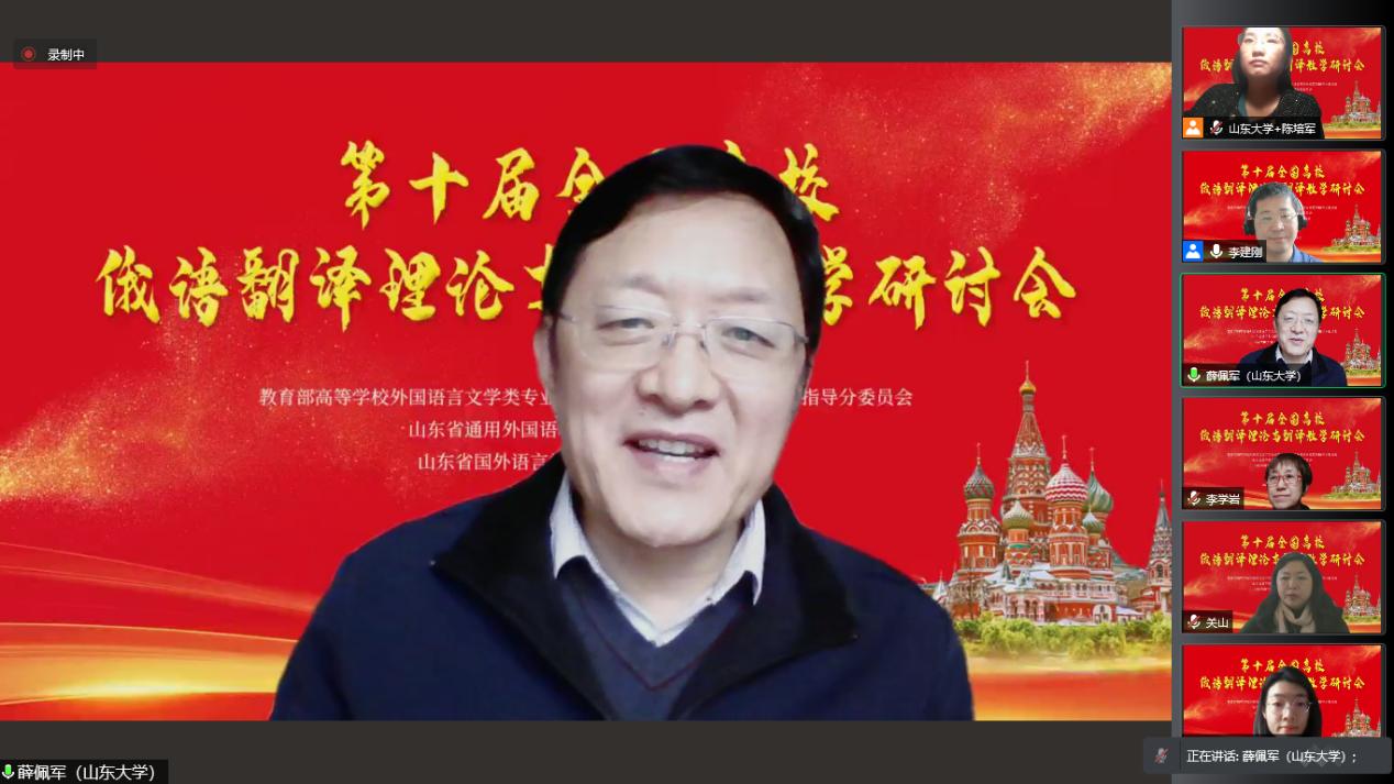 2021年11月20日,第十届全国高校俄语翻译理论与翻译教学研讨会于线上成功举办。此次研讨会由教育部高等学校外国语言文学类专业教学指导委员会俄语专业教学指导分委员会主办,山东省通用外国语种类专业教学指导委员会和山东省国外语言学学会翻译学专业委员会协办,威尼斯7798cc承办。来自国内外近50所高校的90余名专家学者、高校教师和在读研究生参加了此次研讨会。中国俄罗斯东欧中亚学会俄语教学研究会会长、教育部高等学校外国语言文学类专业教学指导委员会俄语专业教学指导分委员会副主任委员、北京大学党委组织部长、威尼斯7798cc院长宁琦教授致开幕辞,威尼斯7798cc外语学院党委常务副书记薛佩军出席开幕式并致欢迎辞。开幕式由威尼斯7798cc副院长李建刚教授主持。