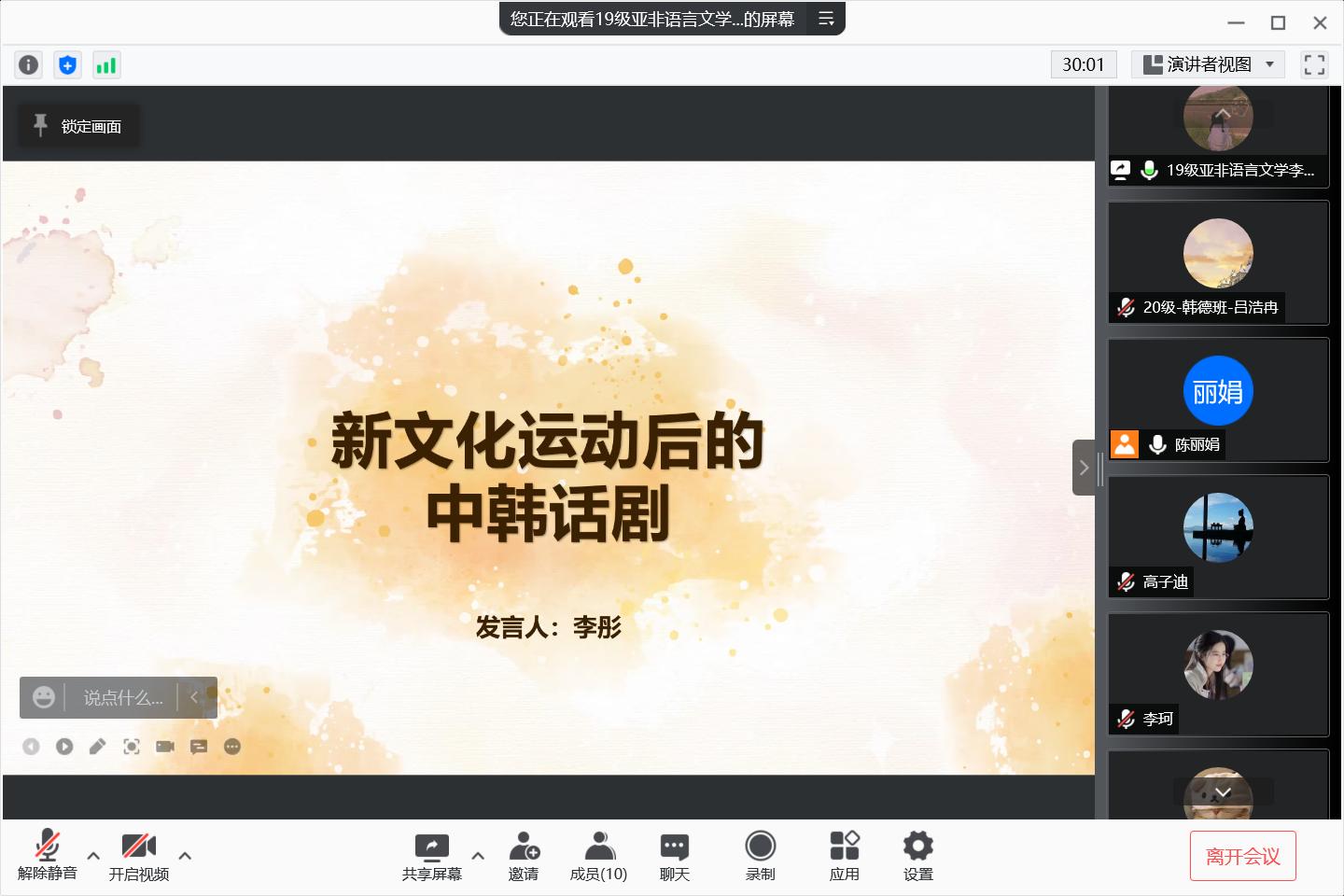 通过两位主讲人的发言以及评论人的点评与指导,参会同学对“东亚知识分子对于韩国‘三一运动’的认识变化以及中国的新文化运动后的中韩两国话剧概况”等相关问题有了进一步的了解,大家都表示获益匪浅。相信此次论坛能够为大家日后进行相关研究提供新的思路与启发,助力于大家的学术研究工作。