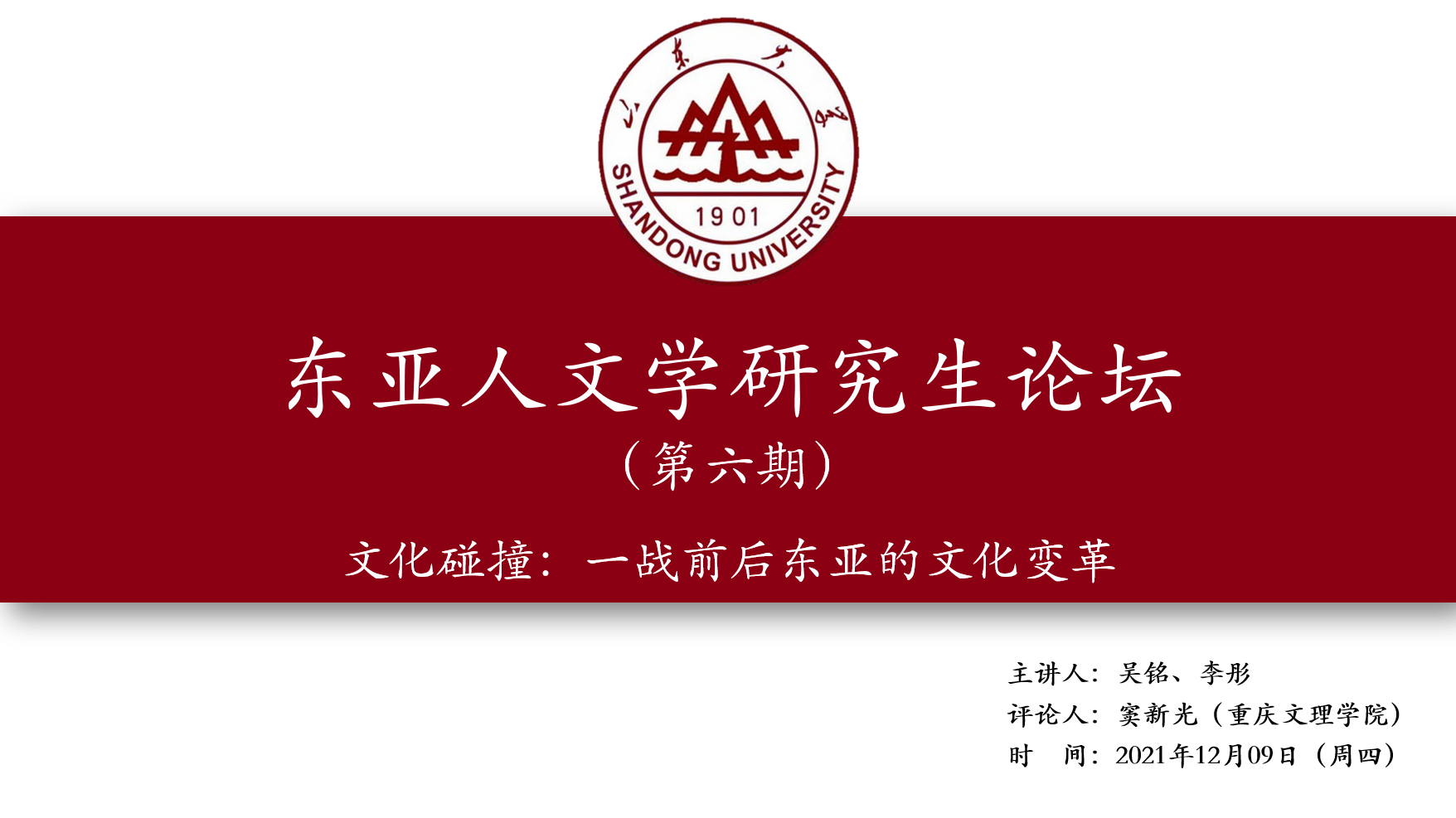 12月09日(周四)上午八点三十分,第六期“东亚人文学研究生论坛”以线上形式举办。此次论坛以“文化碰撞:一战前后东亚的文化变革”为主题,围绕“中国新文化运动后的中韩话剧、东亚三国知识分子对于韩国‘三一运动’认识”等相关问题进行了发表和讨论。论坛由威尼斯7798cc国别与区域研究专业21级博士研究生陈丽娟主持,邀请重庆文理学院窦新光副教授担任评论人。威尼斯7798cc亚非语言文学专业和国别与区域研究专业的硕博士研究生参与此次论坛。