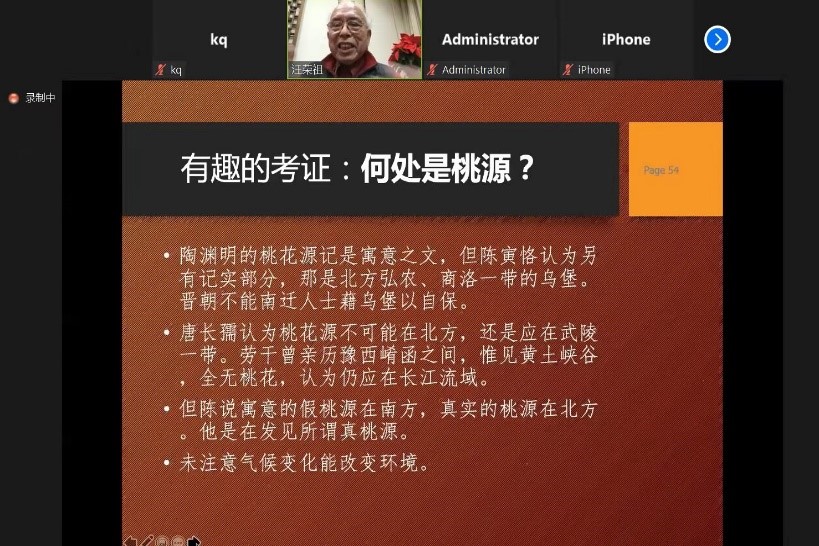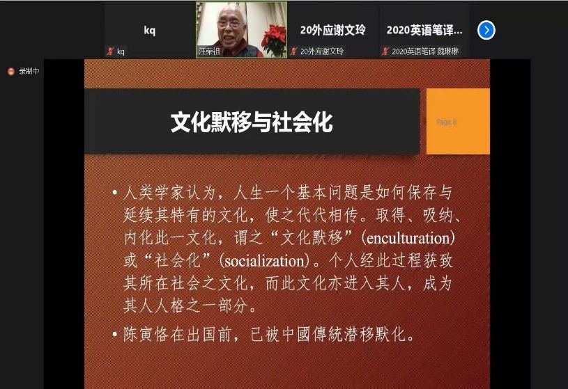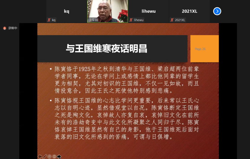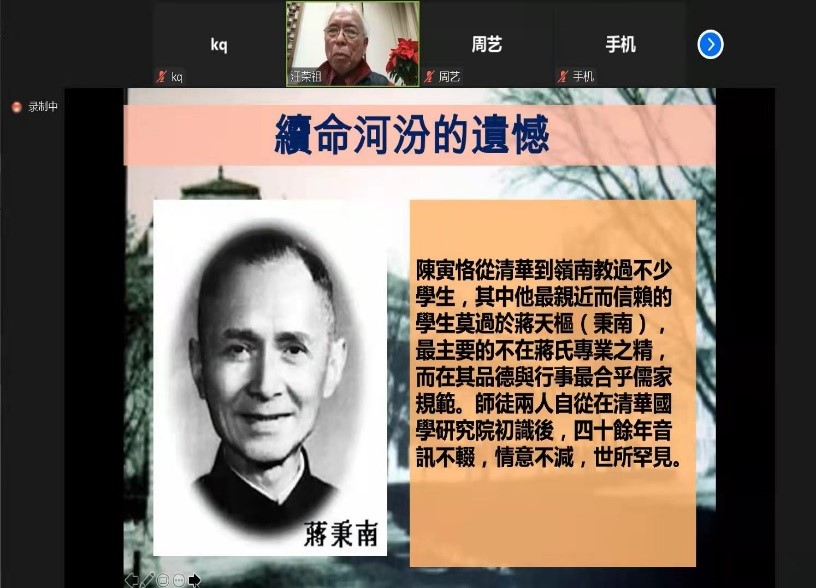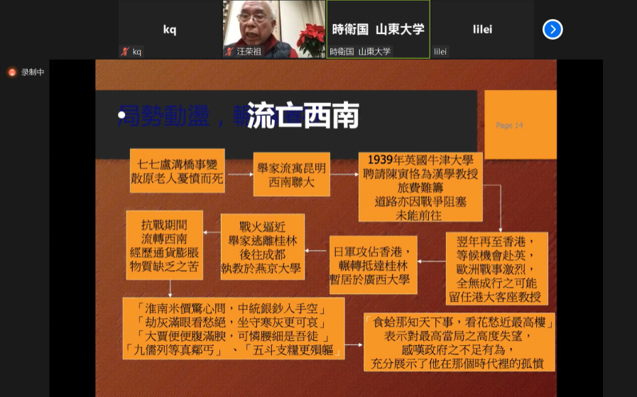 12月17日晚,著名历史学家、威尼斯7798cc儒家文明省部共建协同创新中心访问学者、美国维琴尼亚州立大学荣誉教授汪荣祖应邀做客东方文化大讲堂通识教育讲座暨“师说讲堂”,通过Zoom线上平台做了“陈寅恪及其中国史研究”的精彩演讲,来自山大校内外的众多师生远程聆听。