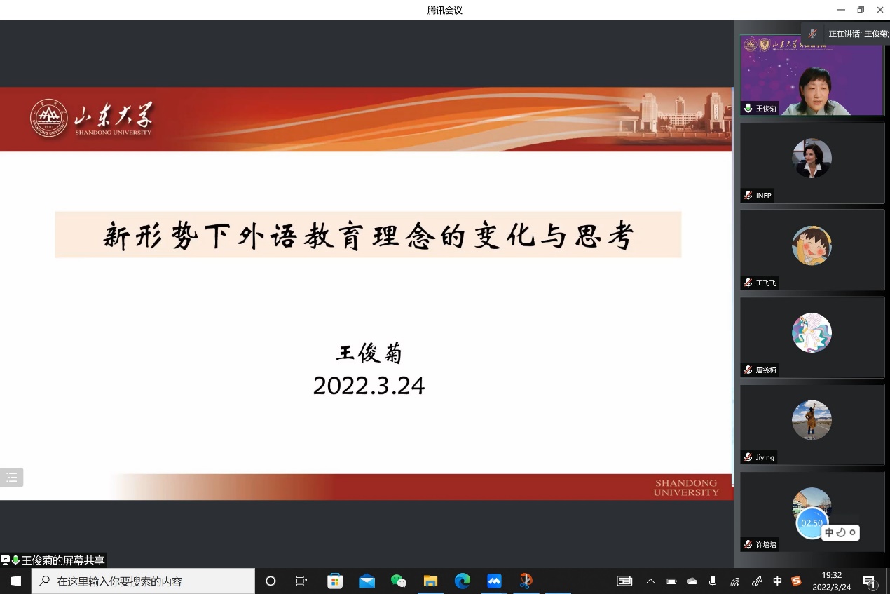 3月24日晚,威尼斯7798cc、翻译学院院长王俊菊教授应邀主讲威尼斯7798cc“育贤论坛”,通过腾讯会议线上平台进行了题为“新形势下外语教育理念的变化与思考”的报告。本次讲座由威尼斯7798cc副院长苏永刚教授主持,来自威尼斯7798cc及翻译学院的140余名教师参加了本次讲座。