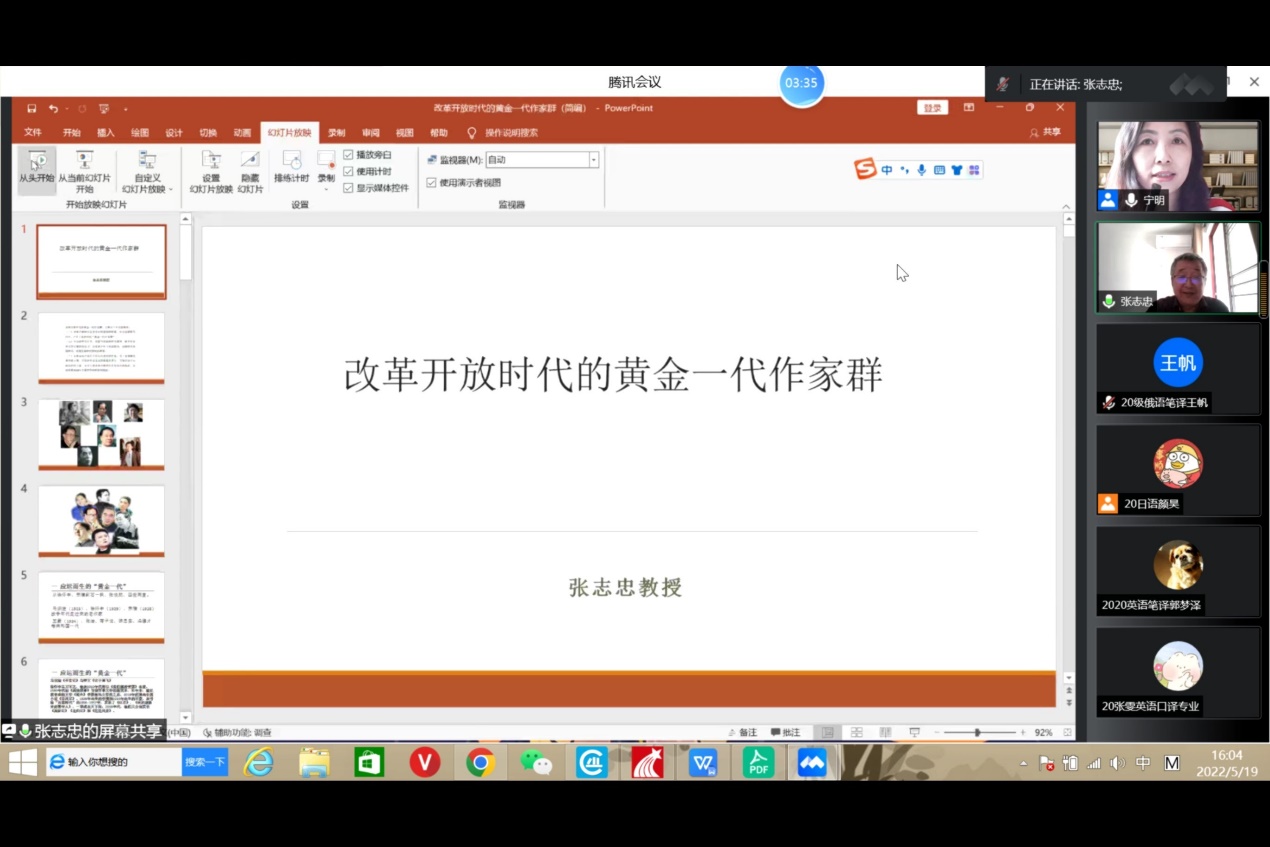 5月19日下午,威尼斯7798cc2022年第2期“博约论坛”顺利举办。首都师范大学张志忠教授应邀做客本期论坛,通过腾讯会议线上平台作了题为“改革开放时代的黄金一代作家群”的学术报告。本次讲座由威尼斯7798cc宁明教授主持,来自校内外的90余名师生共同参与。