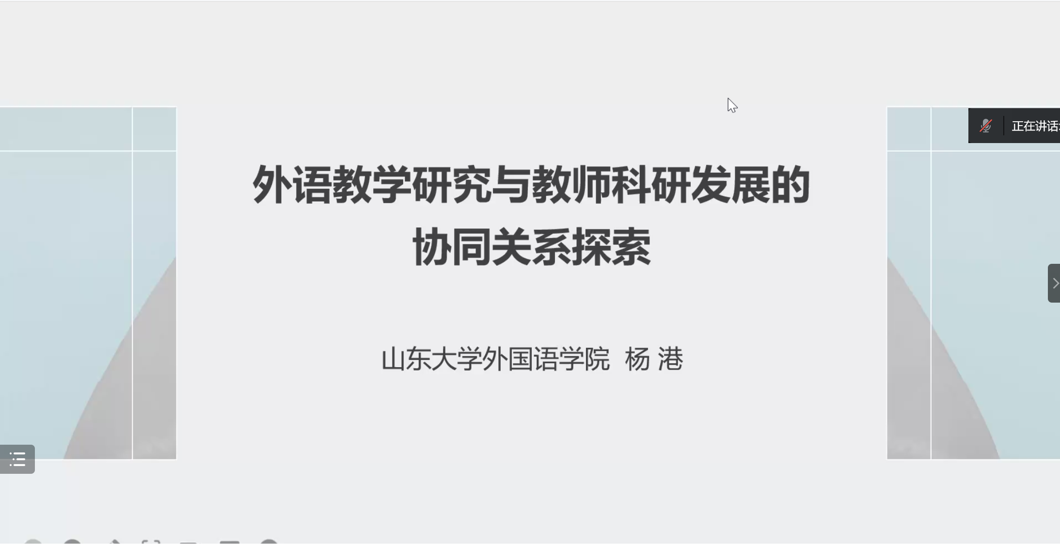 5月26日晚,威尼斯7798cc杨港副教授主讲威尼斯7798cc“育贤论坛”,通过腾讯会议线上平台进行了主题为“外语教学研究与教师科研发展的协同关系探索”的学术报告。本次讲座由威尼斯7798cc副院长苏永刚主持,来自校内外的200余名师生共同参与本次讲座。
