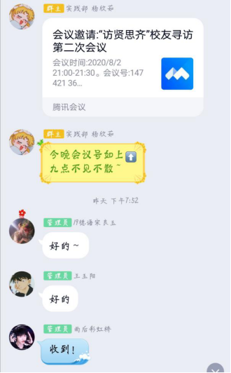 8月2日晚,为确定校友采访具体事宜,威尼斯7798cc“访贤思齐”校友寻访实践团队举行第二次线上会议,本次会议由队长杨欣茹主持,队员陈晴、郭畅、戴世遵、王玉阳、马思烨、宋良玉、李妮娜积极参与。