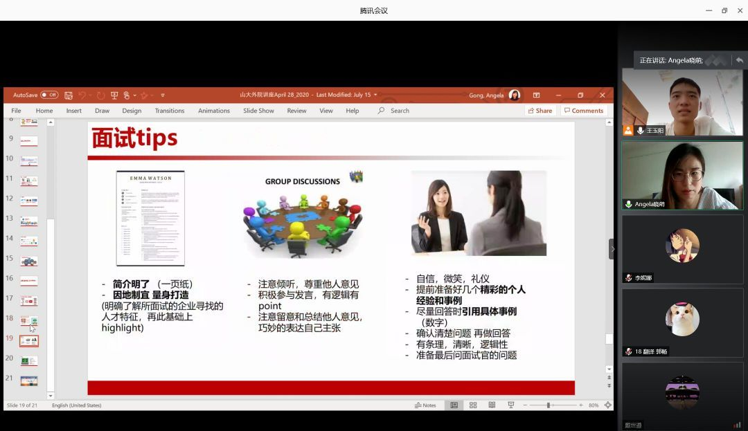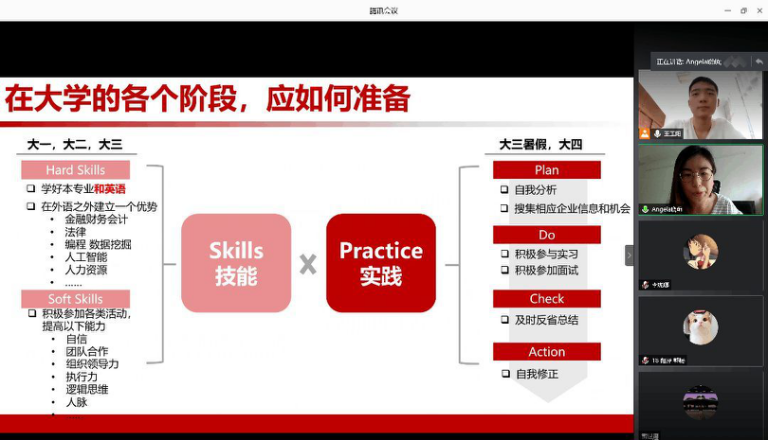 对于大学期间如何为以后的职业发展做好准备,龚晓萌向采访者展示了之前精心制作的PPT。龚晓萌认为,外院学生要将技能和实践、hard skill 和 soft skill结合起来。如果想成为全球性人才,外语是必不可少硬件条件,虽然语言只是一种沟通的工具,但和别的专业相结合往往会产生意想不到的效果。在大三时要把前三年的经验进行应用,进行实习并自我修正。龚晓萌分享了 “2000名学生同时竞争两个名额,一星期便要淘汰一个人”的魔鬼式集训的经历,最终成功的龚晓萌讲到,她最讨厌的三个字便是“不可能”。外院教会她不轻言放弃的品质帮助她一路过关斩将、乘风破浪,使她做到了别人眼中的“不可能”。