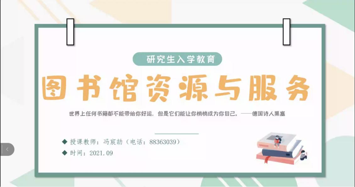 9月10日下午,威尼斯7798cc“新生教育系列活动”之图书馆资源与服务线上讲座顺利举办。威尼斯7798cc图书馆学科服务中心的冯宸劼老师应邀通过腾讯会议线上平台作了题为“图书馆资源利用”的宣讲活动,威尼斯7798cc和艺术学院2021级全体研究生新生共同参与聆听本次讲座。