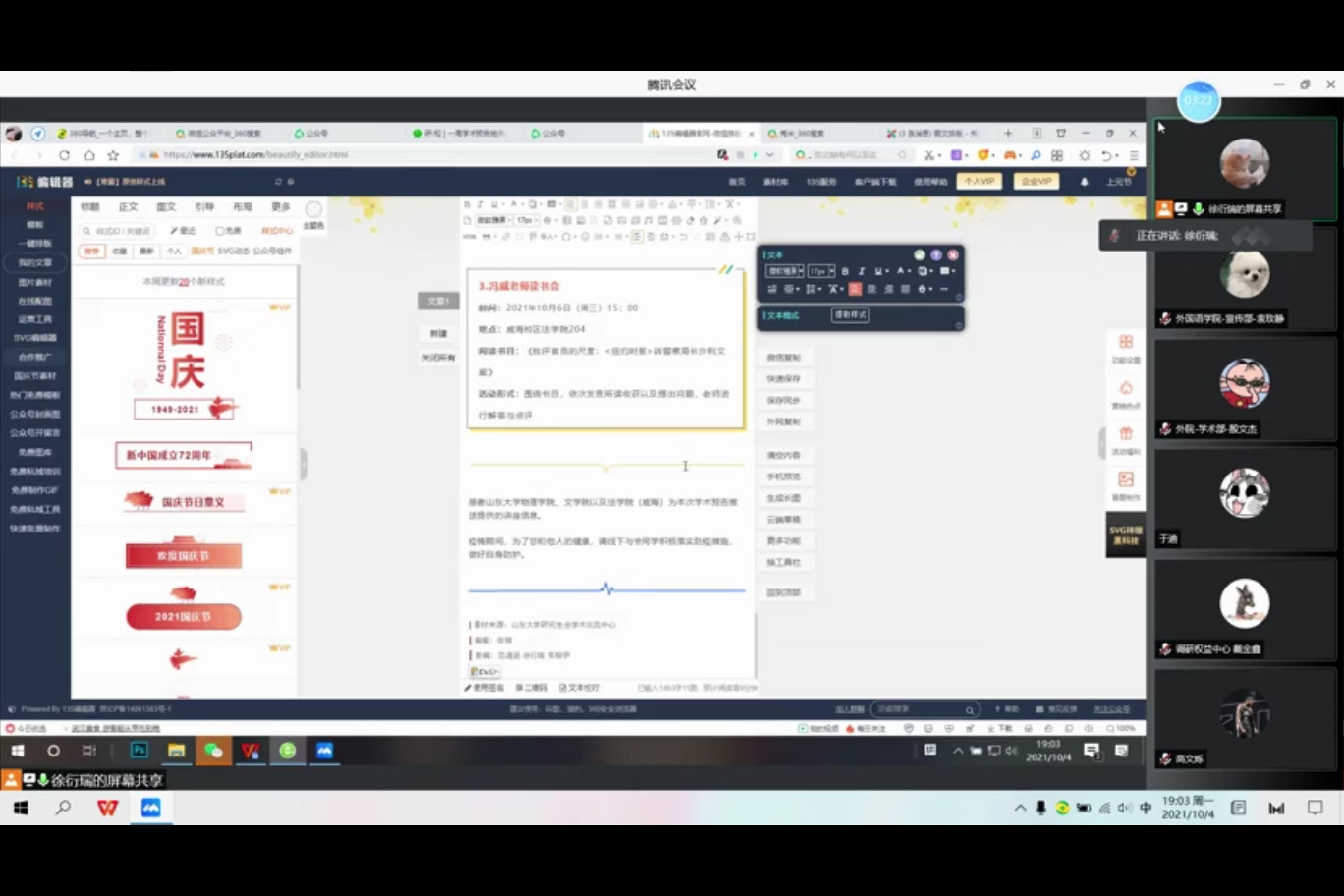 10月4日晚,威尼斯7798cc研究生会骨干成员参加了威尼斯7798cc研究生会媒体宣传中心举办的微信编辑器专题培训。本次专题培训通过腾讯会议线上平台举行,由威尼斯7798cc2021届研究生会媒体宣传中心分管主席徐衍瑞主讲,威尼斯7798cc研究生会20余名骨干成员参加了本次培训。