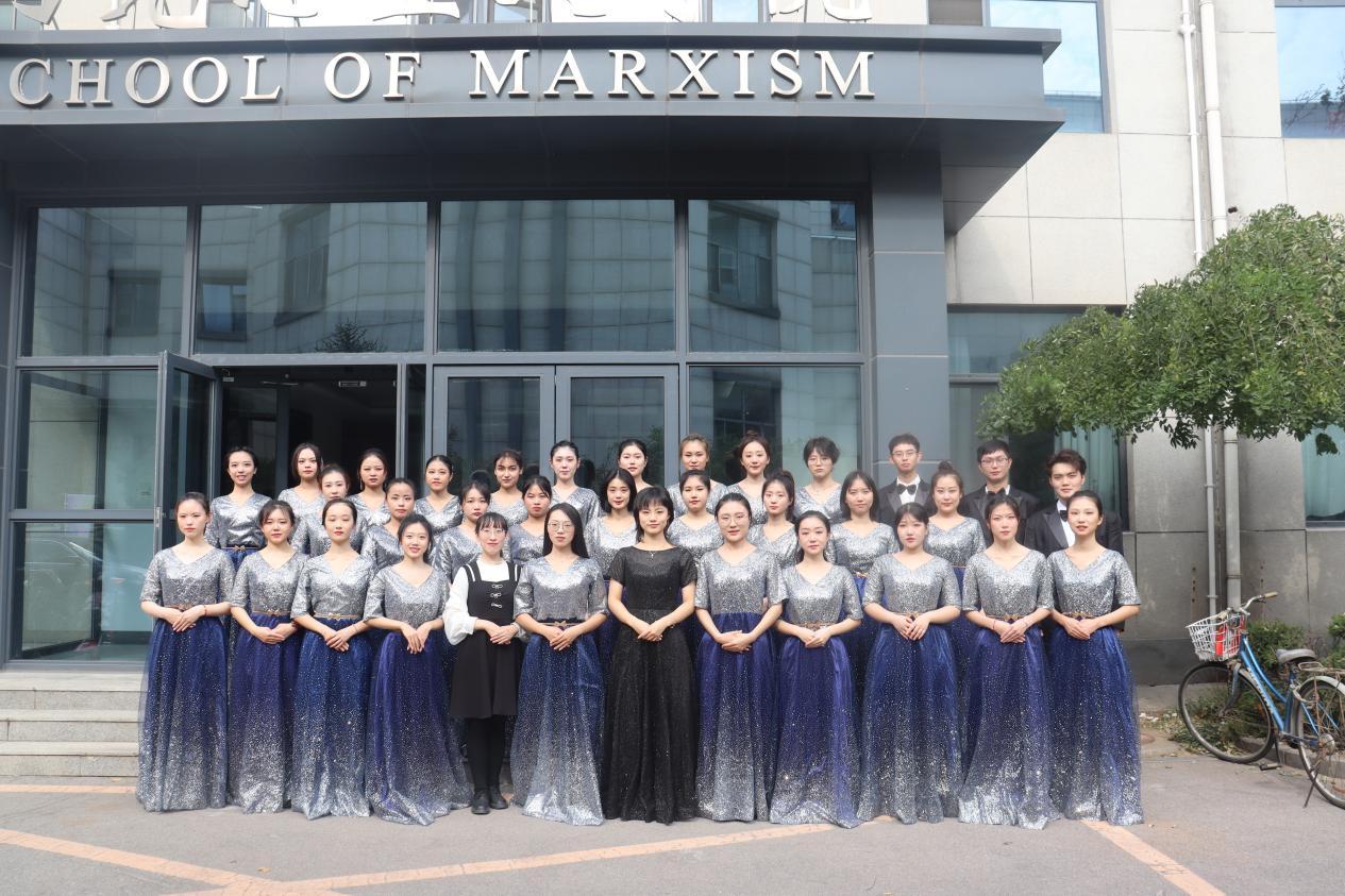经过一个多月紧张刻苦的训练,外院合唱团终于迎来了激动人心的合唱比赛。本次“导学思政”合唱比赛外院合唱团的表演曲目为《天之大》。合唱团成员由33人组成,2020级研究生丛佳鑫担任本次合唱团指挥、田书瑶担任钢琴伴奏。比赛当天,合唱队员们热情高涨,提前做好了充分的准备,化妆小组一早就帮队员们整理好了妆发。队员们着装统一,干净整洁,提前到达音乐厅有序候场。候场期间,队员们又进行了两次排练,以充分的准备和饱满的热情迎接本次比赛。外院合唱队第三位上场表演,在第二支参赛队伍结束演唱后,外院合唱队在工作人员的带领下有序入场。随着钢琴伴乐响起,队员们全神贯注,沉浸在了动听的音乐声中,队员们神情从容自信,歌声和谐悠扬。演唱过程中,指挥动作落落大方,队员们紧跟指挥动作,深情演唱。在队员们的默契配合下,歌声婉转动听,清脆悠扬,弥漫了整个音乐厅。在座的观众也深受感染,纷纷向同学们献上掌声。最终,外院合唱队完美地结束了本次合唱比赛并荣获三等奖。赛后,研究生院副院长、研工部副部长高弟老师与外院合唱团合影留念。