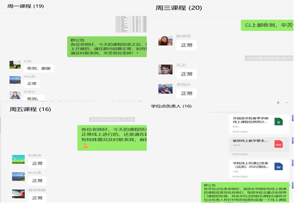 规范教学要求、深化教学管理。建立每日课程群和课程教学工作台账,每日汇总当日开设课程及任课教师,落实授课情况及缺勤学生及原因,每周汇总线上授课情况,综合听课记录反馈内容,上报学院及学校有关部门,精耕细作保障线上教学质量。