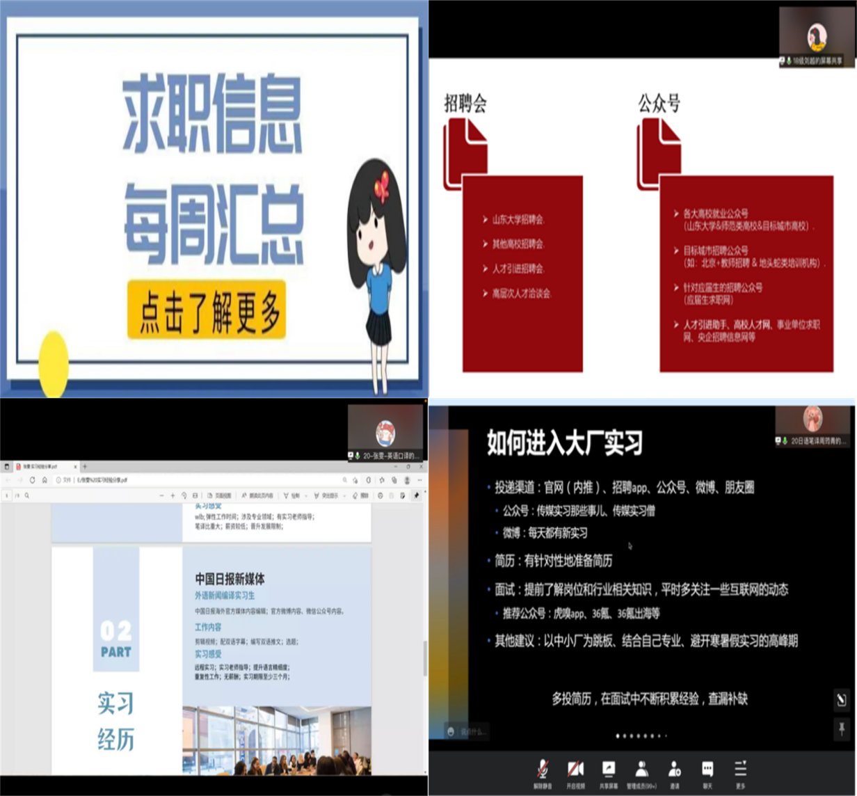 实习就业创未来。面临当前疫情挑战,威尼斯7798cc高度重视就业工作,主动谋划,开展内容丰富、形式多样的就业指导活动,多维度为毕业生提供更广阔的择业空间。为满足同学们的封控期间线上面试等个性化需求,统筹协调现有教室、教师办公室、会议室等场所,避免时间和空间冲突造成的相互影响。举办职业生涯规划经验分享会、第九届学生职业生涯规划大赛等活动,帮助提升职业技能,明确自己的目标和人生规划;针对毕业就业季的来临拟举办就业经验分享会、面试讲座等有助于研究生发展的各项讲座和分享活动,汲取学长学姐成功经验,为就业择业打下坚实基础。每周定时更新实习及招聘信息汇总,就业信息精准推送,拓宽就业渠道,不断加强就业指导、思想引领、跟踪服务、精准帮扶的温度和力度,助力学生更加充分、更高质量就业。