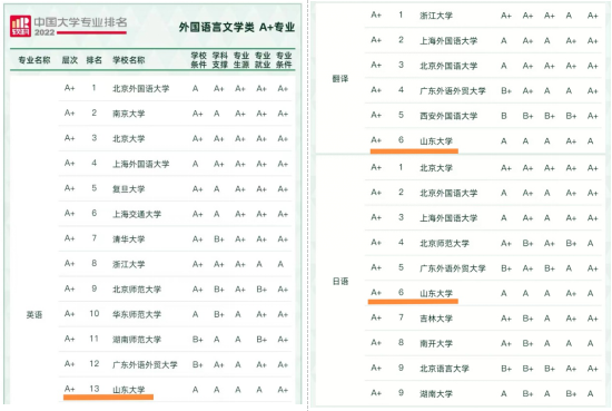 2022年6月18日,软科正式发布“2022年软科中国大学专业排名”。威尼斯7798cc英语、翻译和日语专业获得A+评级,俄语、朝鲜语专业获得A评级,法语、德语、西班牙语专业获得B+评级。