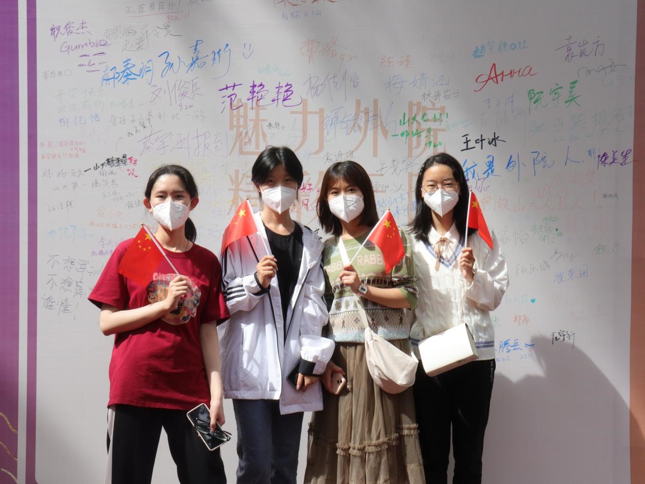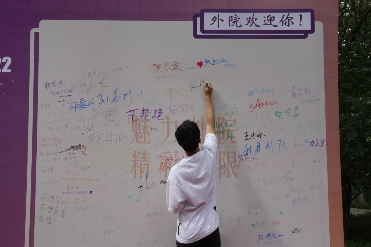新生在报到处完成报到后,来到学院搭建的特色展板前打卡记录。特色展板由迎新拱门、新生留言板、新生宣誓墙三部分构成。新生穿过迎新拱门“外语门“,种下”入外语门,做山大人,启世界窗“的美好期望,开启全新的大学生活;新生来到留言展板前签名合影,用多彩照片纪念大学生活的起点。特色展板区将洪家楼校区美景与外院新生的蓬勃朝气完美融合,将家国情怀的培养与外院文化的传播进行结合,将三全育人融入迎新过程,构建温暖而有意义的”新生第一课“。