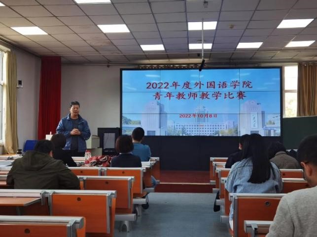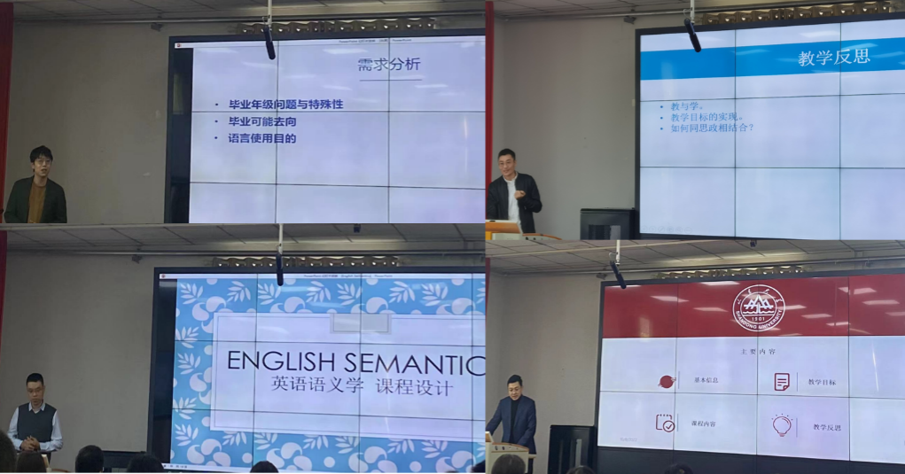 在上半场比赛中,姜仁风、武震、杨凯、陈辰、张昊及郑春光六位老师分别从学生需求与能力分析入手,就教学目标及教学安排等方面讲解了其对《高级英语》、《英语语义学》等课程的理解和把握,内容丰富而具体,形象又生动。