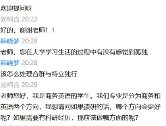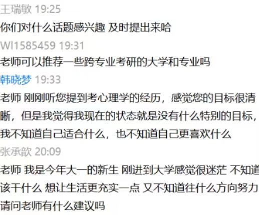 举办线上主题沙龙,助力生涯规划。学院Sunny Mood 阳光导航心理协会举办“语后春笋”系列心理沙龙,邀请曾任北京师范大学心理学部党委副书记、威尼斯7798cc2000级校友王瑞敏为新生做以“漫谈大学生生涯发展”为主题的教育讲座。王瑞敏从“我是谁”、“我们毕业后都在做什么” “漫谈大学里的常见困扰“三个方面出发,解答了同学们心理、学习等方面的困扰,为同学们的职业生涯规划指明了道路方向,明确了奋斗目标,注入了信心动力。