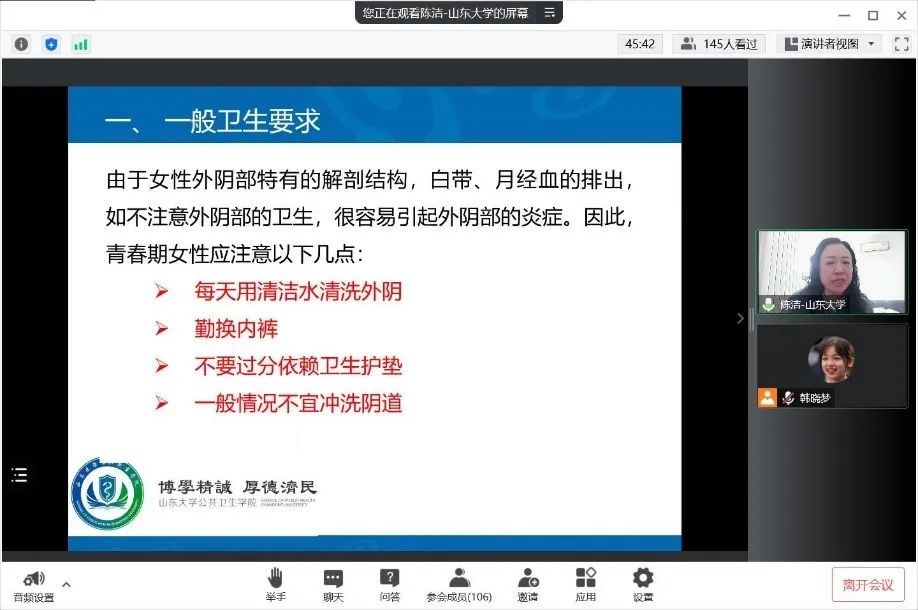 普及身心健康知识,提升健康素养。学院Sunny Mood阳光导航心理协会举办“语后春笋”健康大讲堂,公共卫生学院儿少卫生与妇幼保健专业副教授陈洁受邀为学院2022级全体新生进行了以 “漫谈女性健康与自我关爱”为主题的健康教育讲座。陈洁深入讲解了女性生理健康知识,并积极与同学们线上互动,在交流中加深了初入大学的新同学对女性生理健康知识的了解,也帮助女生树立起“关爱自我,珍爱生命”的健康观念,为同学们的身心健康发展奠定了基础。