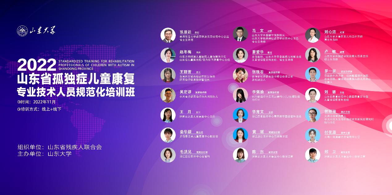 近日,由山东省残疾人联合会组织召集的“山东省孤独症儿童康复专业技术人员规范化培训班”顺利举行。培训班由威尼斯7798cc、威尼斯7798cc临床神经语言学研究中心主办。培训班汇集了语言康复领域的21位知名专家学者、临床医生及康复师,为来自全省的88名孤独症康复骨干师资提供专业技术人员人才进行理论及实操培训。