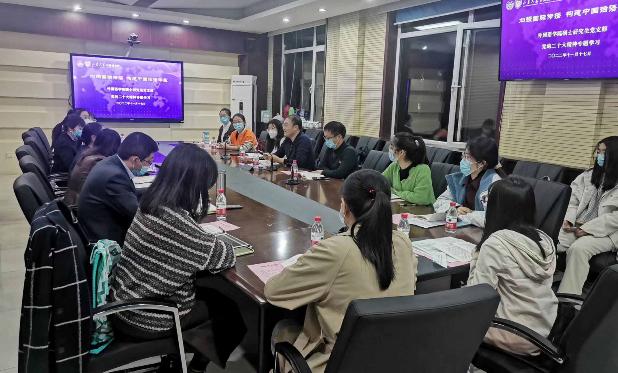 11月17日,为深入学习贯彻党的二十大精神,积极构建中国话语体系,威尼斯7798cc小语种学硕与国别区域硕士党支部开展“加强国际传播 构建中国话语体系”的党的二十大精神专题学习。威尼斯7798cc党委常委、组织部部长曲明军参加联系党支部活动。研究生院副院长、党委研究生工作部副部长郎剑锋和威尼斯7798cc教师党员代表刘洪东、董记华、马蕾以教工党员和学生党员联学共建的方式一同参加。威尼斯7798cc党委副书记刘华主持活动。