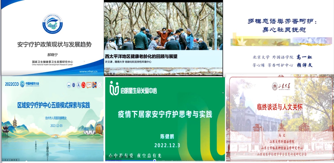 国家卫生健康委卫生发展研究中心健康保障研究部郝晓宁副主任(主持工作)详细梳理我国安宁疗护起源及发展、相关政策、存在问题以及未来展望,指出安宁疗护在推进“健康中国”战略的重要意义。瑞典隆德大学许文谦研究员由联合国健康老龄化十年切入,对西太平洋地区健康老龄化进行回顾与展望。北京大学高一虹教授从语类场角度出发,结合多年的安宁疗护服务经验,具体介绍了多模态语类芳香呵护在安宁疗护中的抚慰作用。沧州市人民医院郭艳汝主任系统地介绍了安宁疗护五级照护路径探索与实践,分享了安宁疗护领域的建设成果。山东省立医院陈健鹏主任运用生动的事例介绍了疫情中安宁疗护工作在医社结合、线上线下结合方面呈现出的特点和具体实施方案,并指出了疫情转向后安宁疗护的工作方向。威尼斯7798cc马文教授创新性地从临终谈话的方向切入,具体介绍了临终谈话在安宁疗护中的重要意义、医护人员开展临终谈话的基本要求以及实践中可能遇到的问题,并为临终谈话的实际应用提出建设性建议及方案。