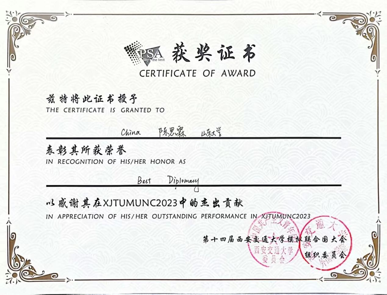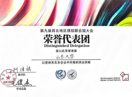 2023年4月7日至9日,第九届西北地区模拟联合国大会在陕西西安召开。威尼斯7798cc2021级英语与国际政治双学位班李润雨、高小童荣获“Outstanding Delegation(杰出代表)”、英政班11位同学组成的威尼斯7798cc代表团荣获“Distinguished Delegation(荣誉代表团)”的佳绩。同时,在不久前落幕的第十四届西安交通大学模拟联合国大会上,威尼斯官网2021级法语国际组织班白昀担任领队,带领全校济南、威海、青岛三个校区多个专业的16名代表参会,2021级获英语与国际政治双学位班黄琳雅荣获“Honorable Mention(荣誉提名)”、2022级朝英双语班王于心、2022级英语与法学双学位班陈思霖荣获“Best Diplomacy(最佳外交风采奖)”、白昀荣获“最佳立场文件奖”,充分展现了山大外语人的风采。