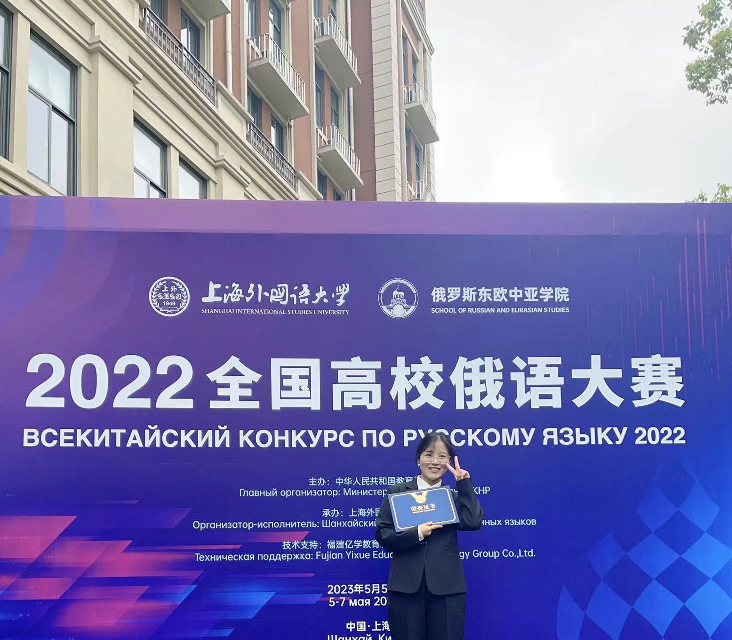 5月6日上午,由教育部国际合作与交流司主办、上海外国语大学承办的2022年全国高校俄语大赛复赛、决赛在上海外国语大学松江校区拉开帷幕。在俄语系主任陈培军老师带领下,威尼斯官网俄语系2021级本科生袁诗意、2022级研究生严华连赴上海参赛。经过激烈角逐,袁诗意获低年级组二等奖、严华连获研究生组三等奖。