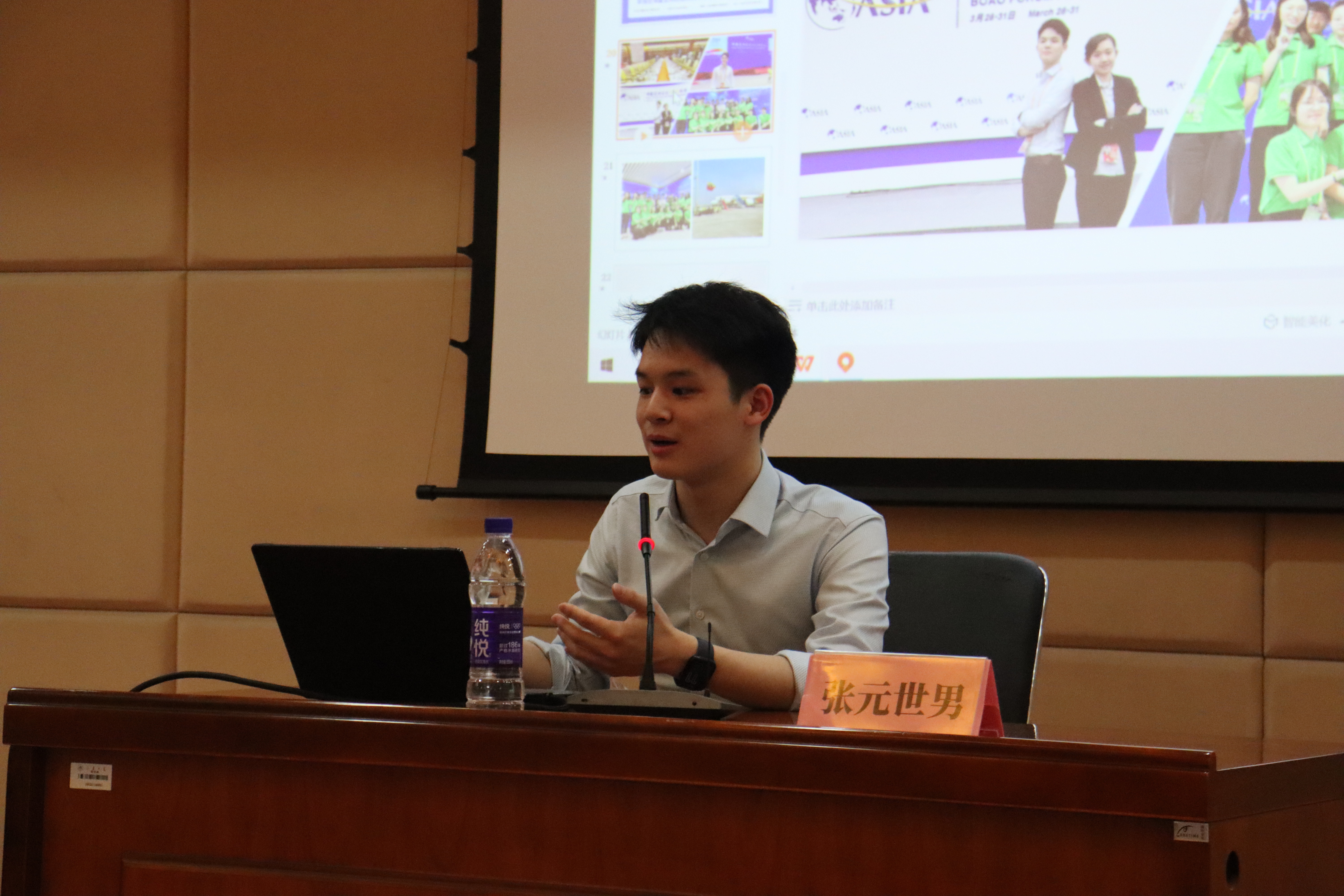 张元世男为在场观众带来了以“中国青年国际组织实践”为主题的分享。他分享了自己参加青年国际组织实践的相关经历与经验,并鼓励同学们积极参加相关社会实践、国际组织实习与比赛等。