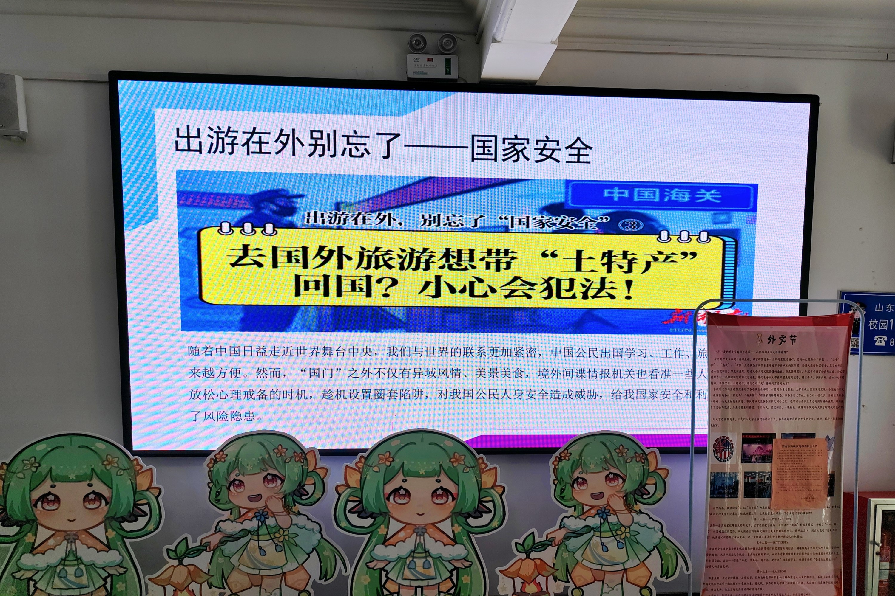 加大宣传展示力度,布设安全教育主题海报。为推进安全宣传教育工作,学院精心设计国家安全教育主题海报,在洪家楼校区七号楼大屏上滚动播放,利用直观的图片和文字向学生宣传国家安全的重要意义,教育引导学生树立总体国家安全观,提高国家安全意识,自觉关心、维护国家安全,让国家安全理念走近学生,入脑入心。