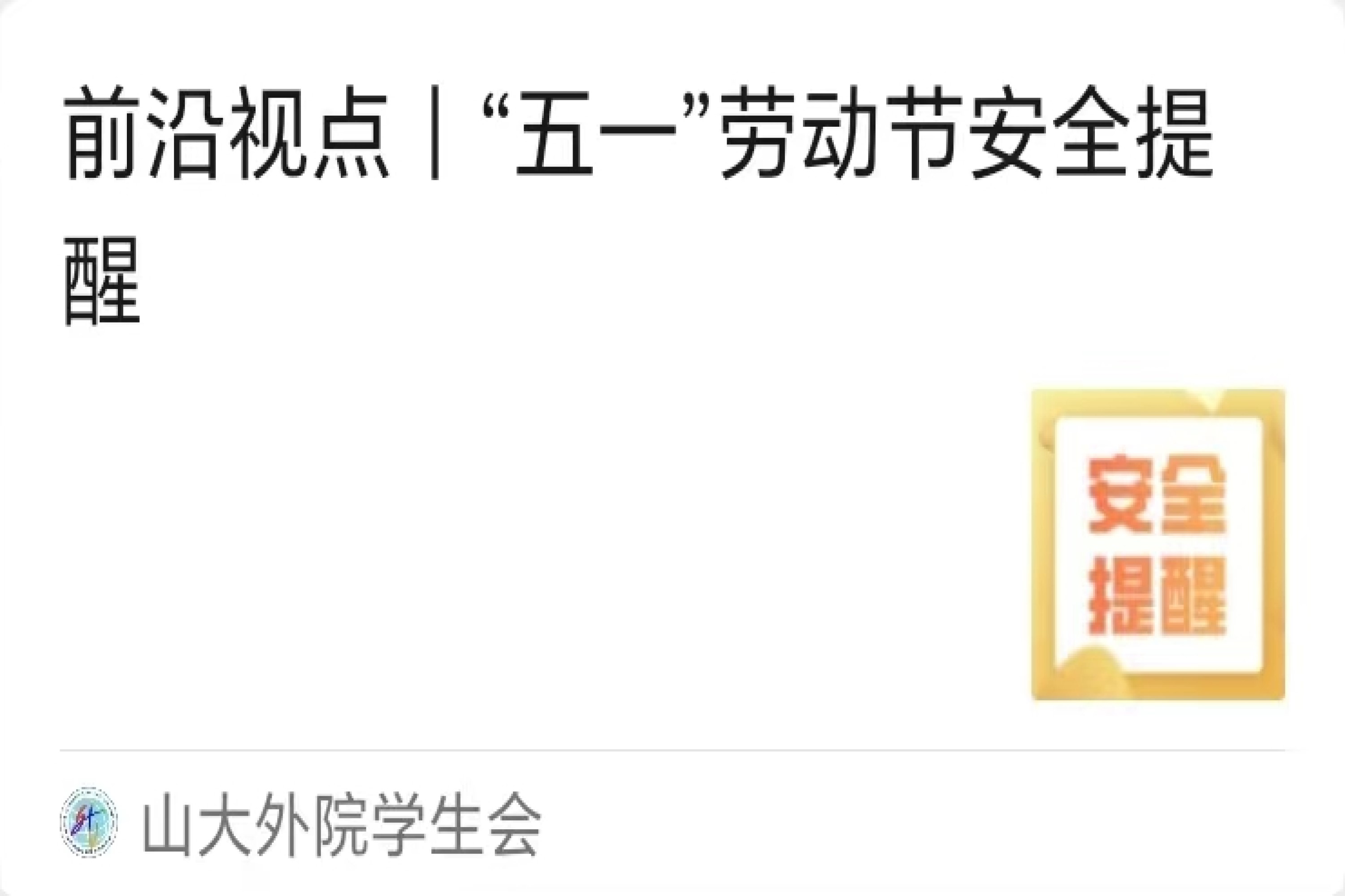 抓住重要时间节点,下发五一安全温馨提示。为严格落实学校假期安全工作要求,学院在劳动节小长假来临之际,及时发布五一假期安全提示,督促学生在假期中养成良好习惯,建立假期安全心理防线,提高自身安全防范意识,助力同学们度过安全、充实、祥和的五一假期,确保假期安全管理工作“不断线”“常更新”“再深入”,营造健康向上的假期氛围,护航学生们假期人身与财产安全。