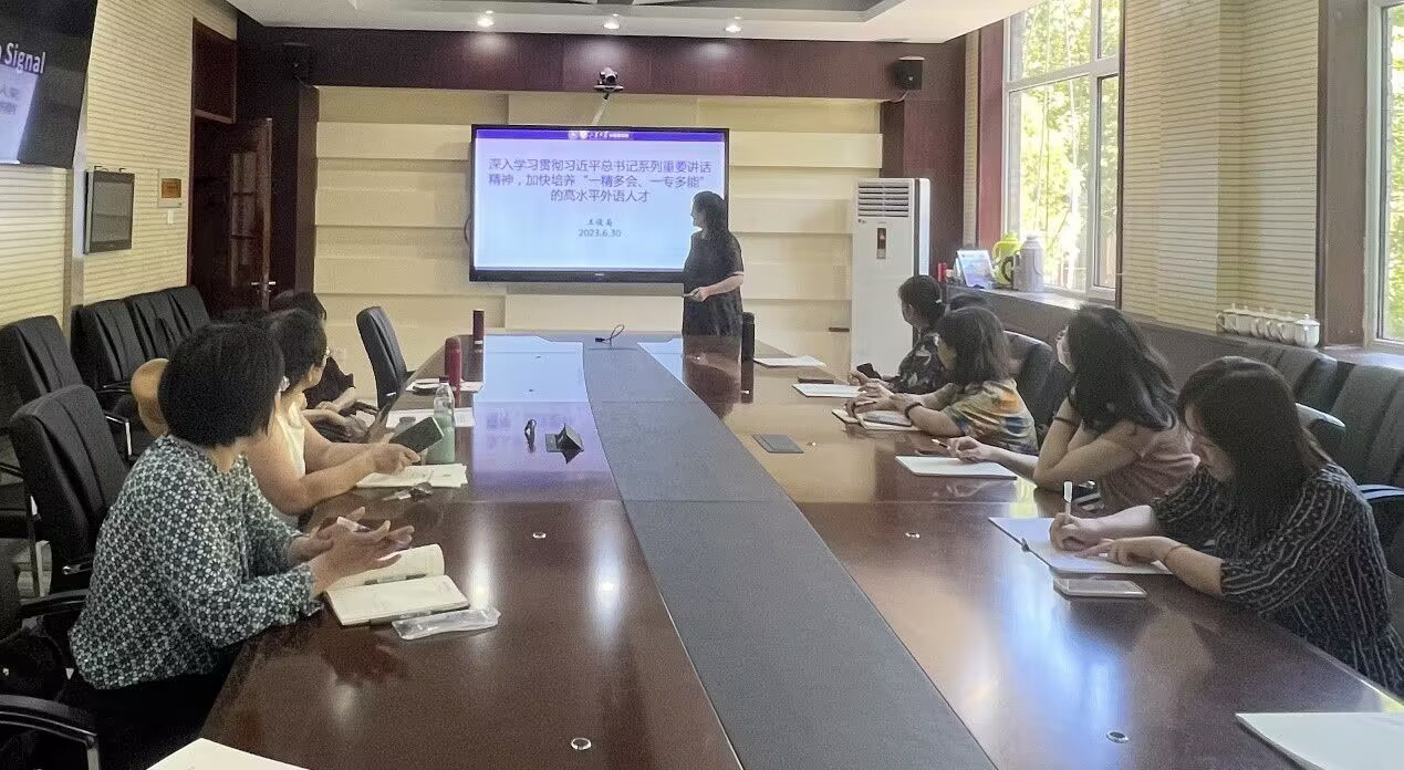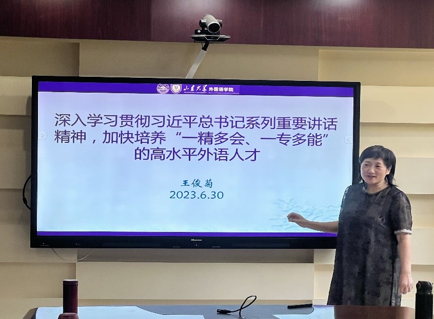 6月30日下午,为推动学习贯彻习近平新时代中国特色社会主义思想主题教育走深走实,威尼斯7798cc院长、党委副书记王俊菊为教学团队第一党支部的党员老师们讲授了一堂题为“深入学习贯彻习近平总书记系列重要讲话精神,加快培养‘一精多会、一专多能’的高水平外语人才”的专题党课。